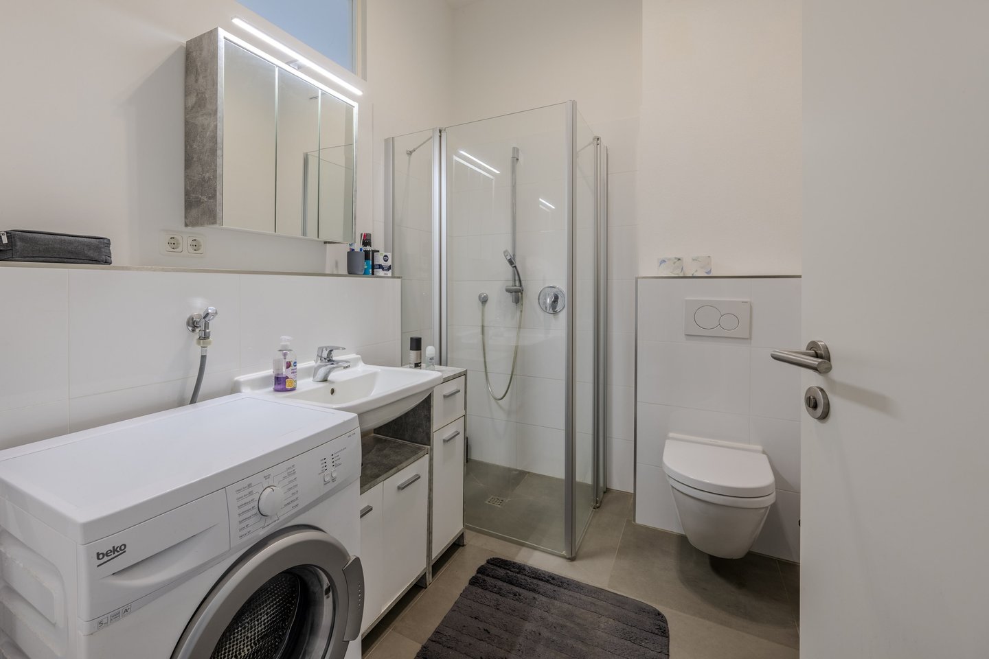 Das große Duschbad ist modern gestaltet und entspricht dem zeitgemäßen Standard der Kernsanierung / neuen Baujahr. Klare Linien, hochwertige Materialien und eine kompakte, durchdachte Planung unterstreichen den gepflegten Gesamteindruck der Wohnung. Ein Waschmaschinenanschluss ist selbstverständlich integriert.