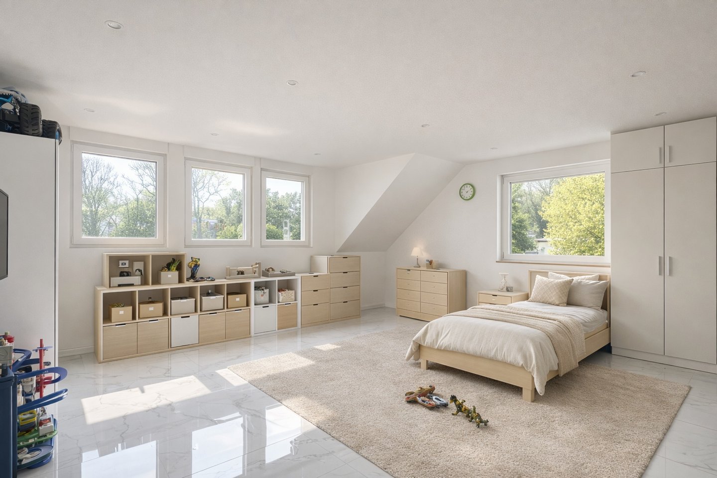 Der zentrale Wohnbereich überzeugt durch seine Offenheit und bietet direkten Zugang zu Balkon und Terrasse. Dadurch entsteht eine harmonische Verbindung zwischen Innen- und Außenbereich. Der weitläufige Garten auf dem ca. 1.500 m² großen Grundstück bietet viel Platz für Erholung, Gestaltung und Privatsphäre.