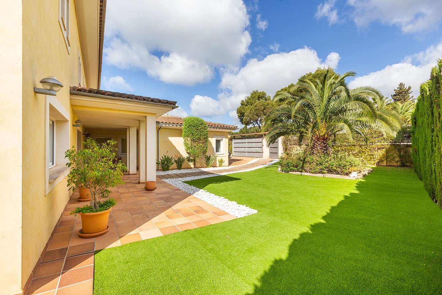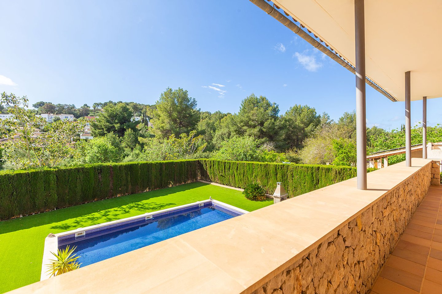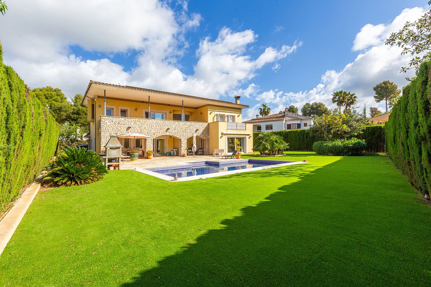 Schon beim ersten Blick überzeugt die Immobilie durch ihr weitläufiges, schön eingewachsenes Grundstück mit einem liebevoll angelegten Garten. Der sattgrüne Rasen, eingerahmt von hohen Hecken und mediterranen Pflanzen, schafft eine idyllische Rückzugsoase. Im Mittelpunkt des Außenbereichs steht der Pool auf Salzwasserbasis, ergänzt durch eine Außendusche und großzügige Terrassenflächen. Ein Bereich mit BBQ lädt zu geselligen Stunden im Freien ein, während die sonnige Südausrichtung optimale Lichtverhältnisse garantiert.