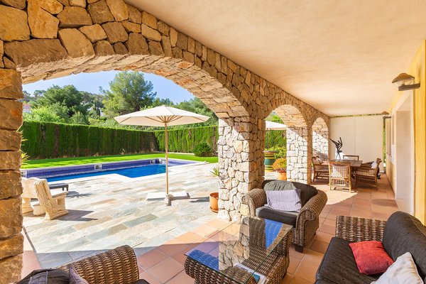 Die überdachte Terrasse im Erdgeschoss, mit ihren charaktervollen Natursteinbögen, bietet einen herrlichen Blick in den Garten und auf den Pool. Hier entsteht ein fließender Übergang zwischen Innen- und Außenbereich.