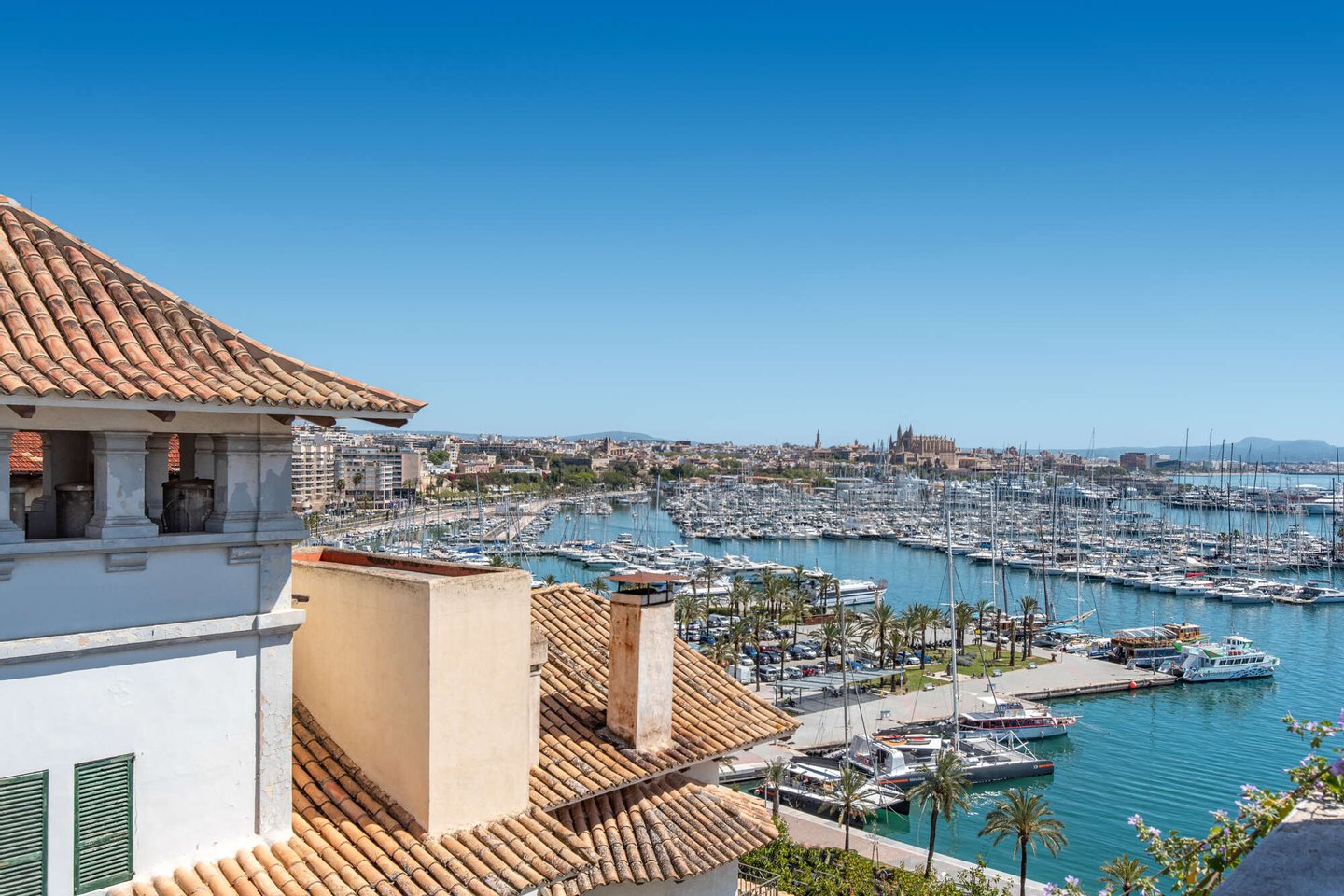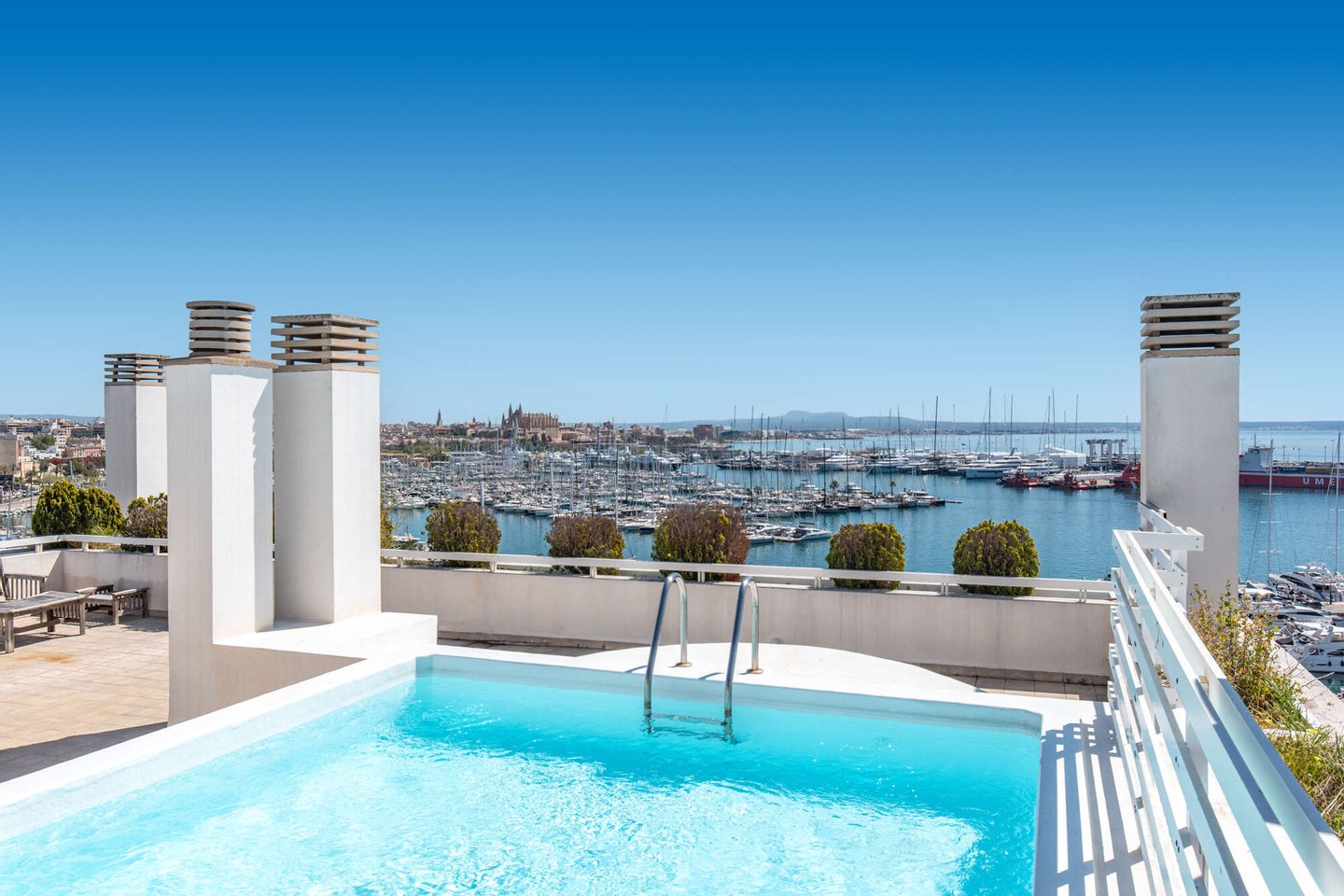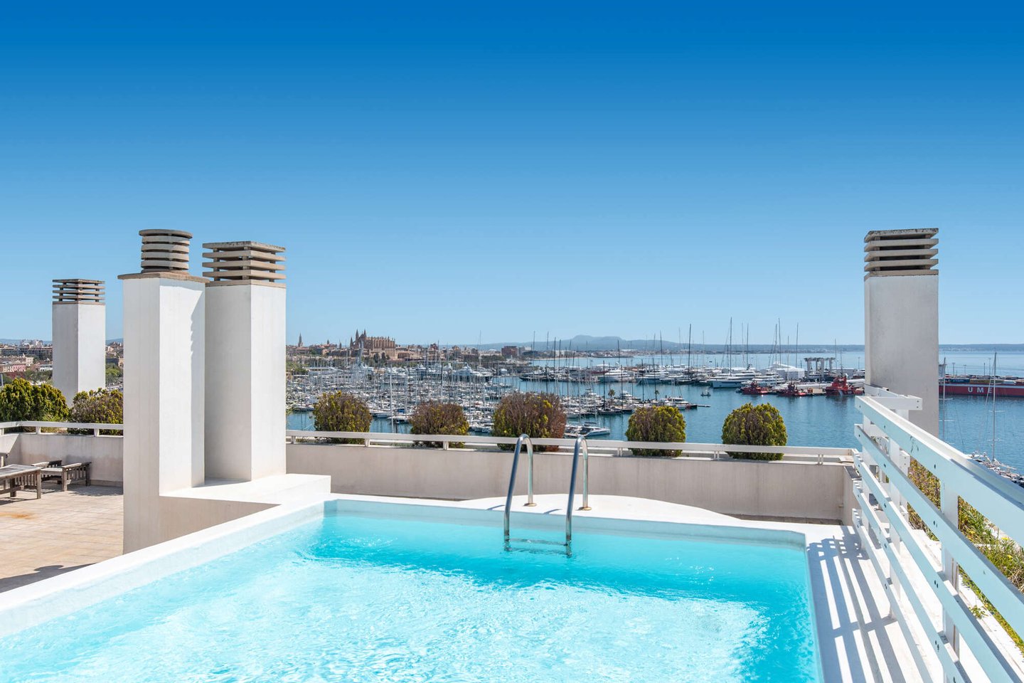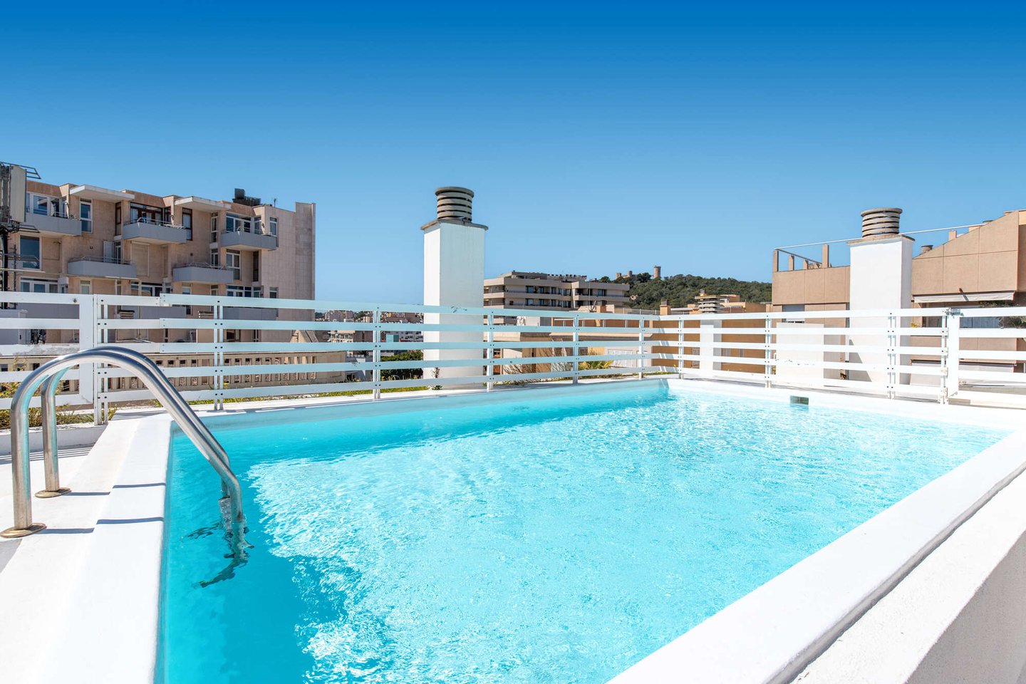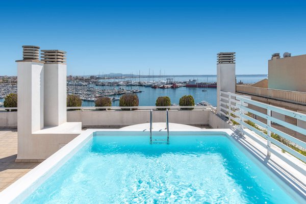 Große Gemeinschaftsterrasse mit Pool auf dem Dach mit fantastischem Ausblick auf Hafen, Meer, Castell Belver und die Kathedrale