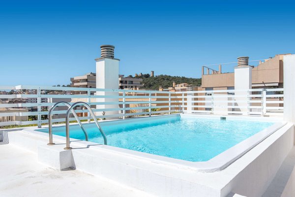 Große Gemeinschaftsterrasse mit Pool auf dem Dach mit fantastischem Ausblick auf Hafen, Meer, Castell Belver und die ...mehr lesen