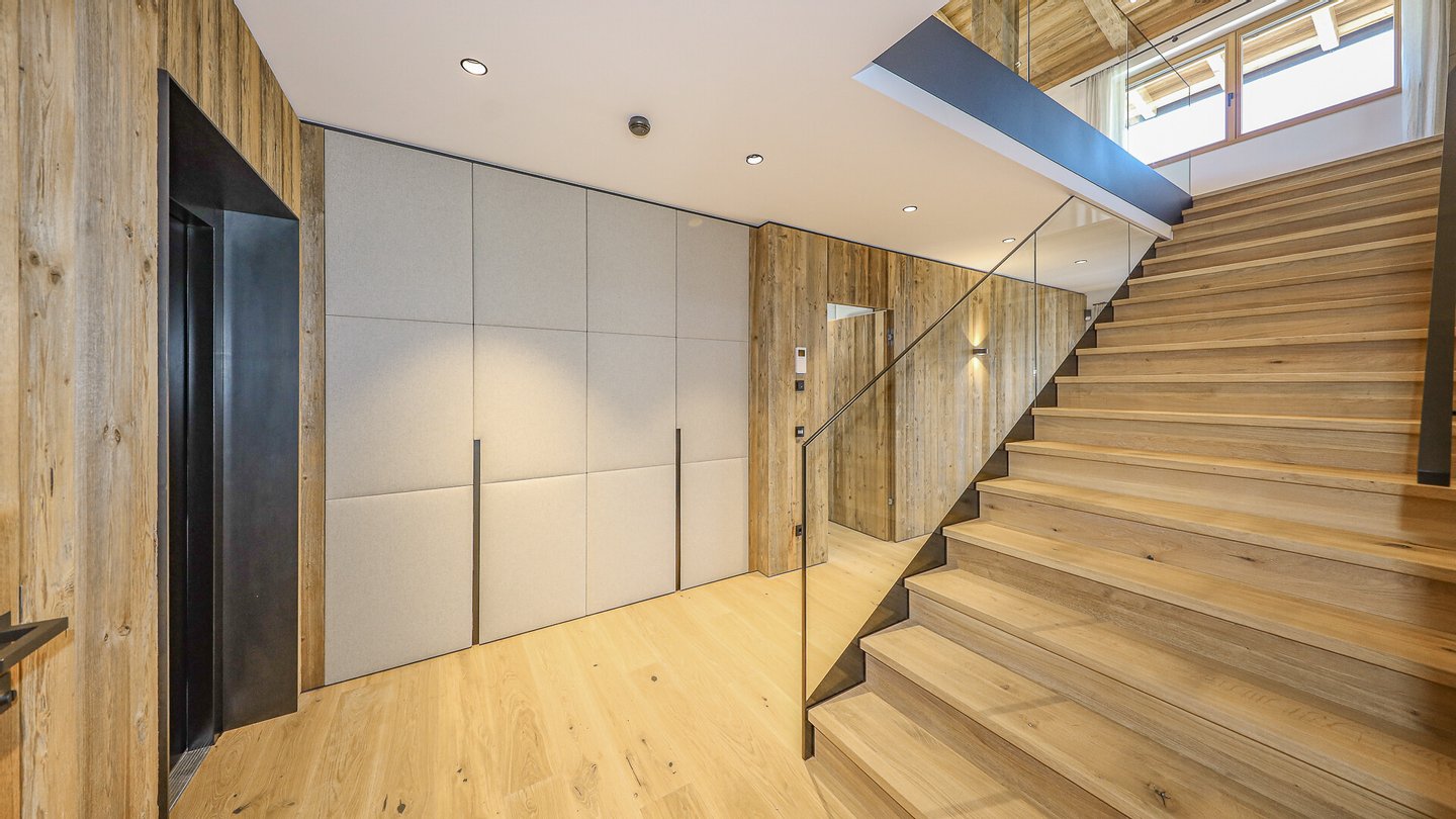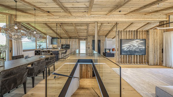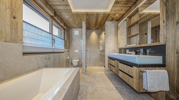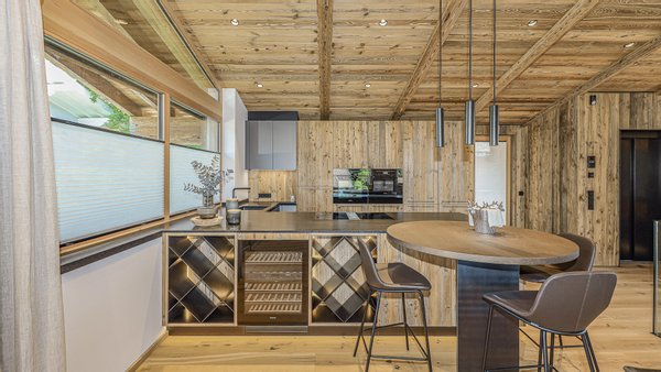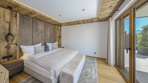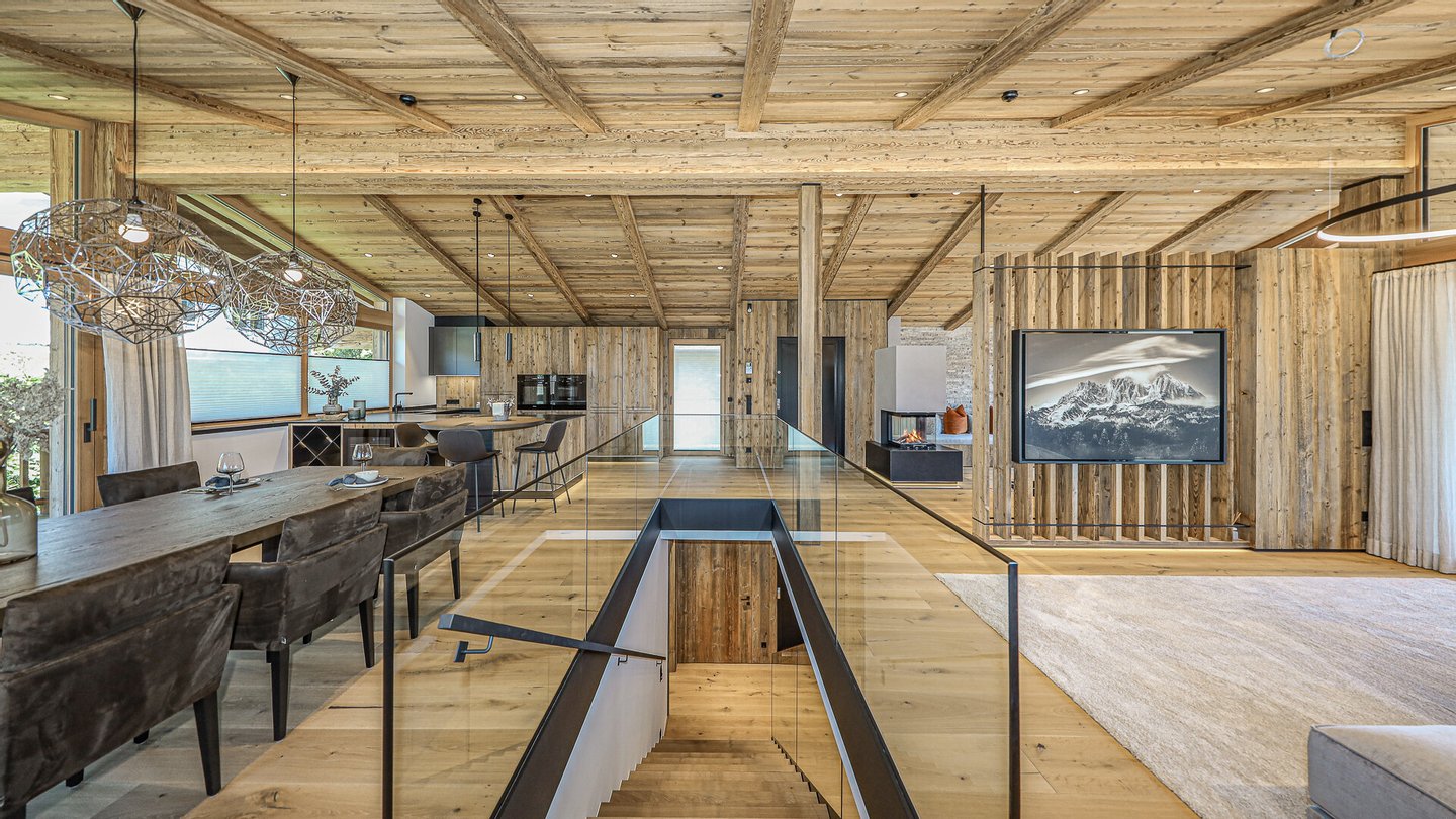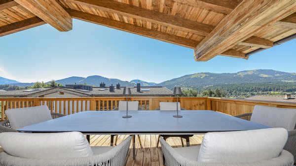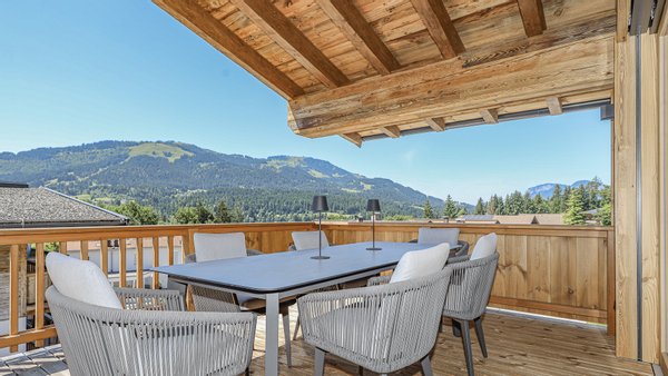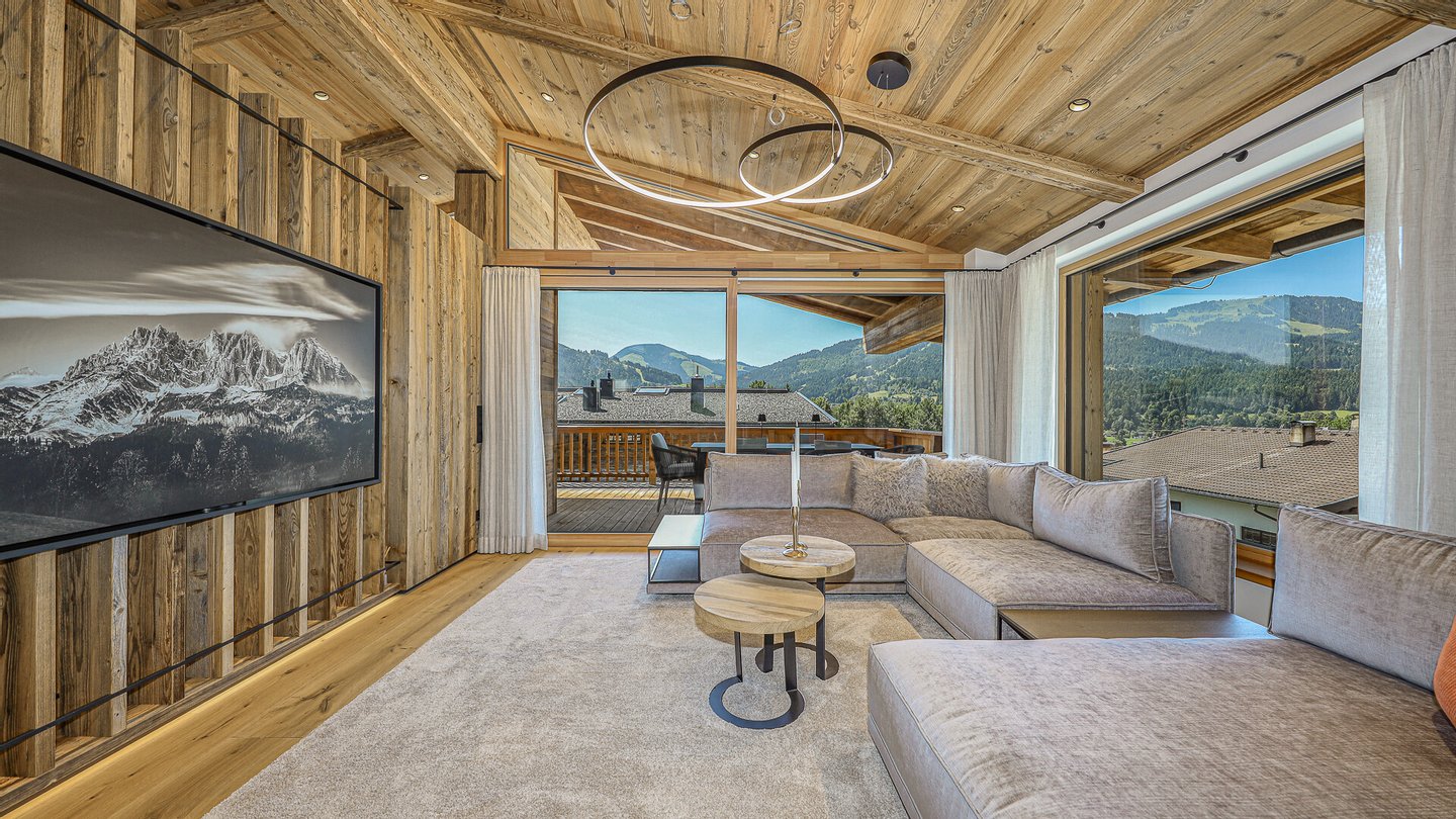 Der gemütliche Wohnbereich mit offenem Kamin und Ausgang auf die Richtung Süden ausgerichtete Terrasse, laden ein, es sich hier gemütlich zu machen. Die zwei Terrassen bieten einen wunderschönen Ausblick auf das Kitzbüheler Horn sowie den Wilden Kaiser. Errichtet und ausgestattet wurde das Chalet mit den hochwertigsten und feinsten Materialien.