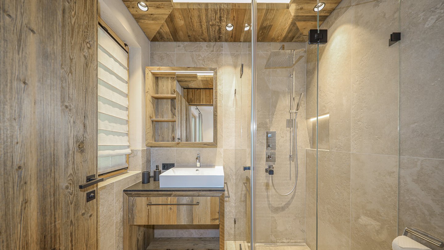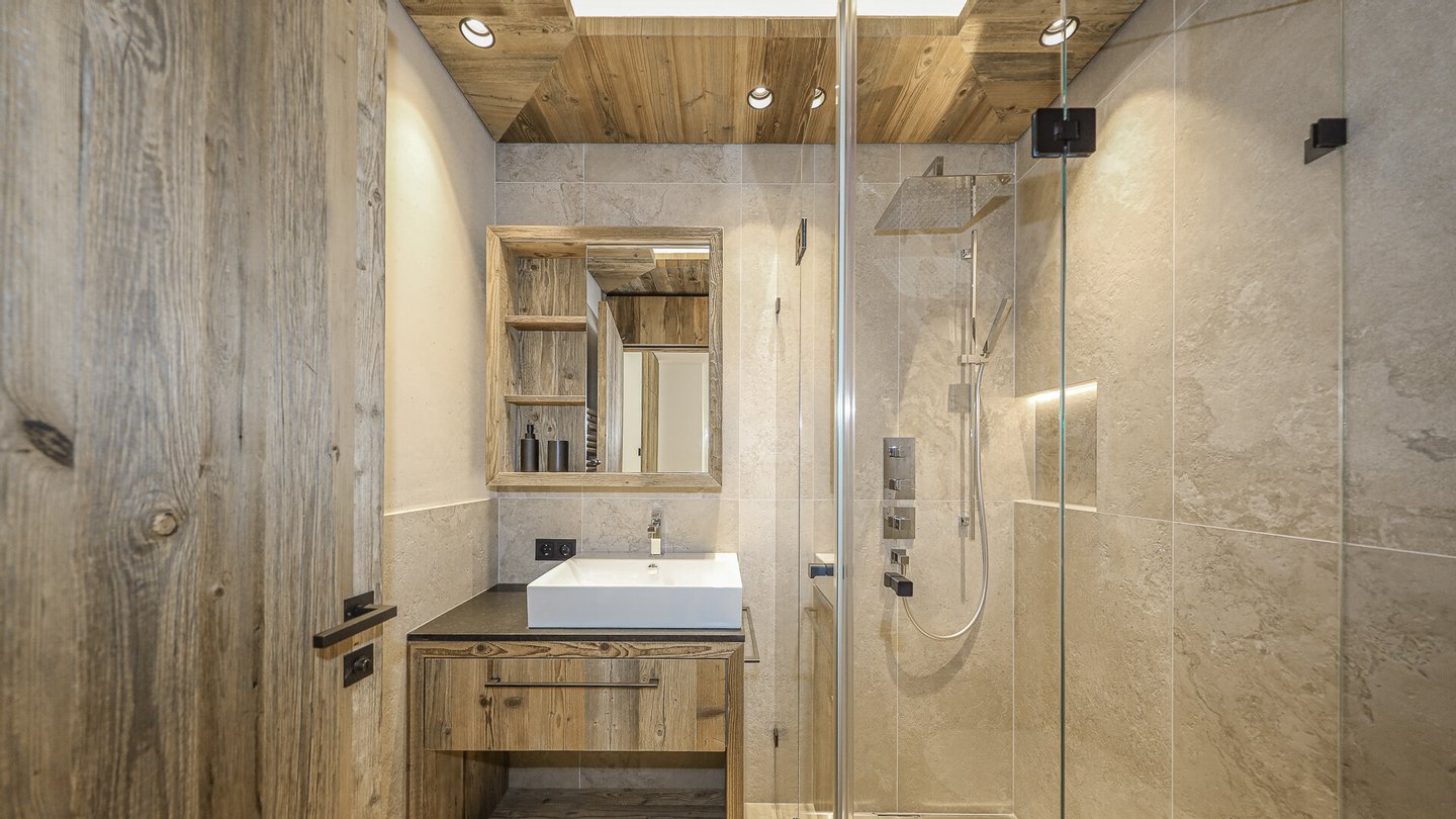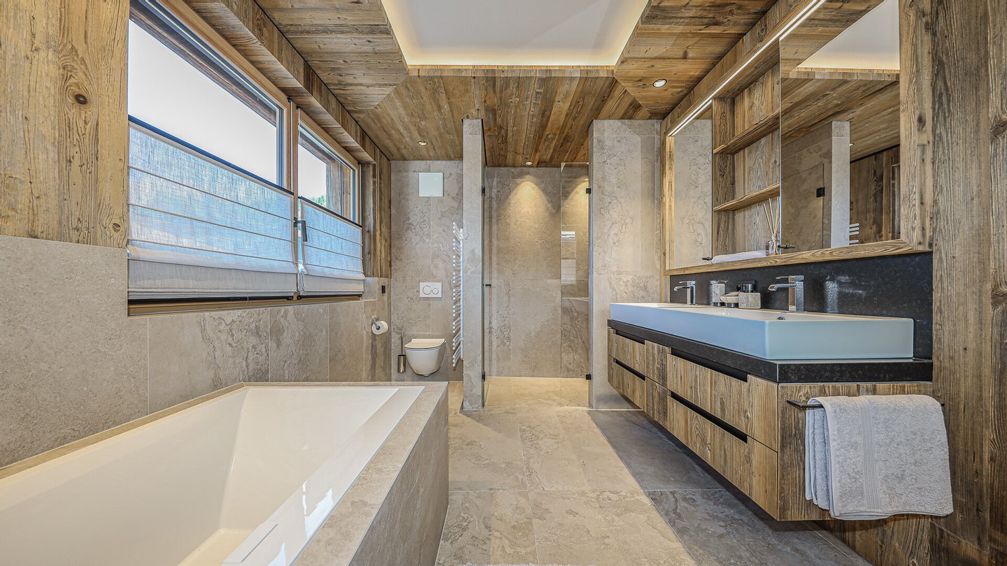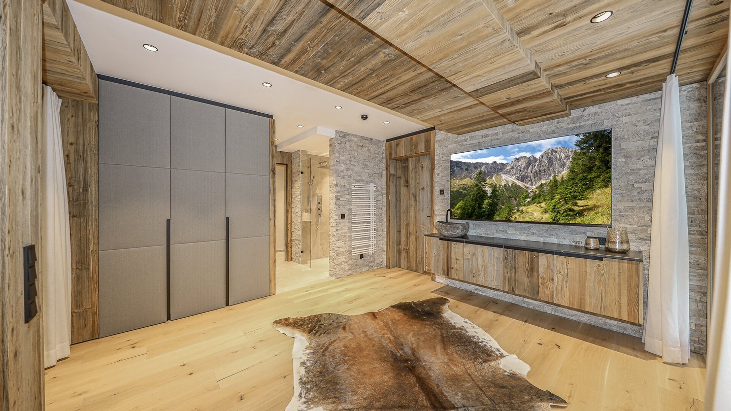 Der gemütliche Wohnbereich mit offenem Kamin und Ausgang auf die Richtung Süden ausgerichtete Terrasse, laden ein, es sich hier gemütlich zu machen. Die zwei Terrassen bieten einen wunderschönen Ausblick auf das Kitzbüheler Horn sowie den Wilden Kaiser. Errichtet und ausgestattet wurde das Chalet mit den hochwertigsten und feinsten Materialien.