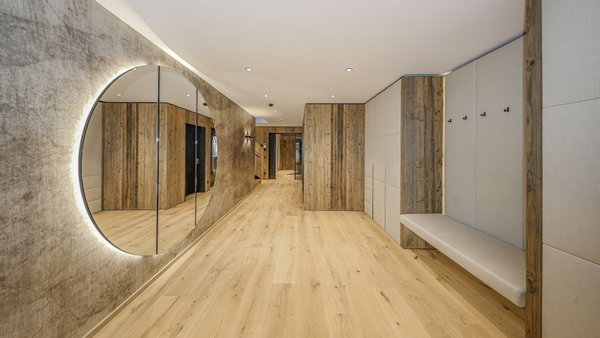 Über den Hauseingang oder durch die Garage gelangt man in die geräumige Garderobe mit zahlreichen Einbauschränken und angrenzendem Hauswirtschaftsraum. Ein Schlafzimmer mit Badezimmer en suite und Ausgang auf einen Lichthof sowie der Wellnessbereich mit Dusche, WC, Sauna und ebenfalls Zugang in einen Lichthof mit Whirlpool befinden sich ebenfalls auf dieser Ebene.
