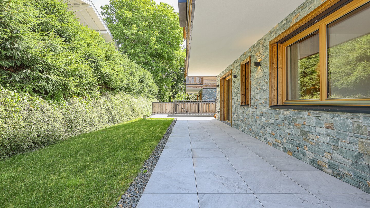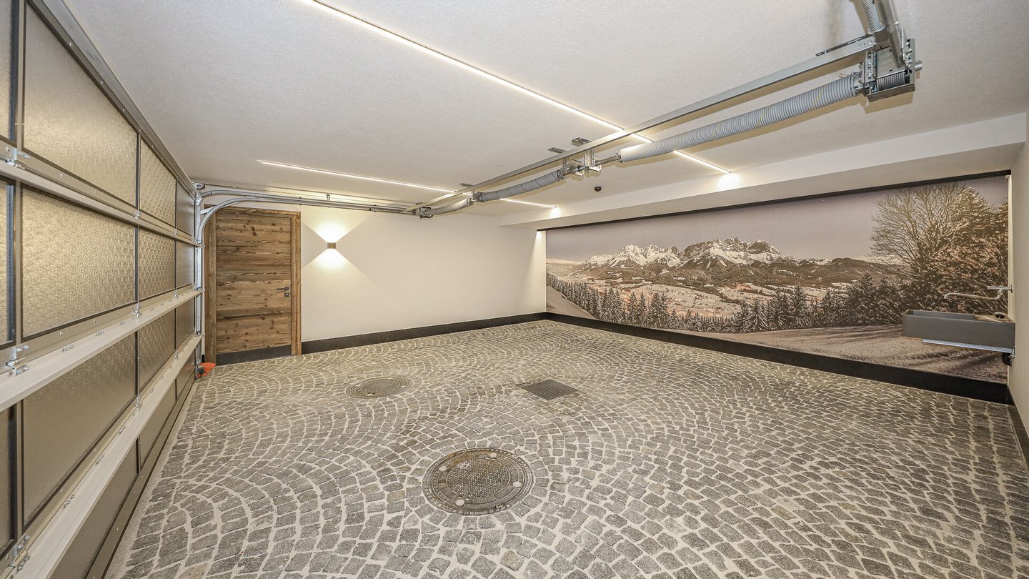Dieses Chalet teilt sich wie folgt auf: Im Untergeschoss gelangt man über eine repräsentative Privatzufahrt direkt in die großzügige Doppelgarage dieses Hauses mit separatem Sportgeräteraum.