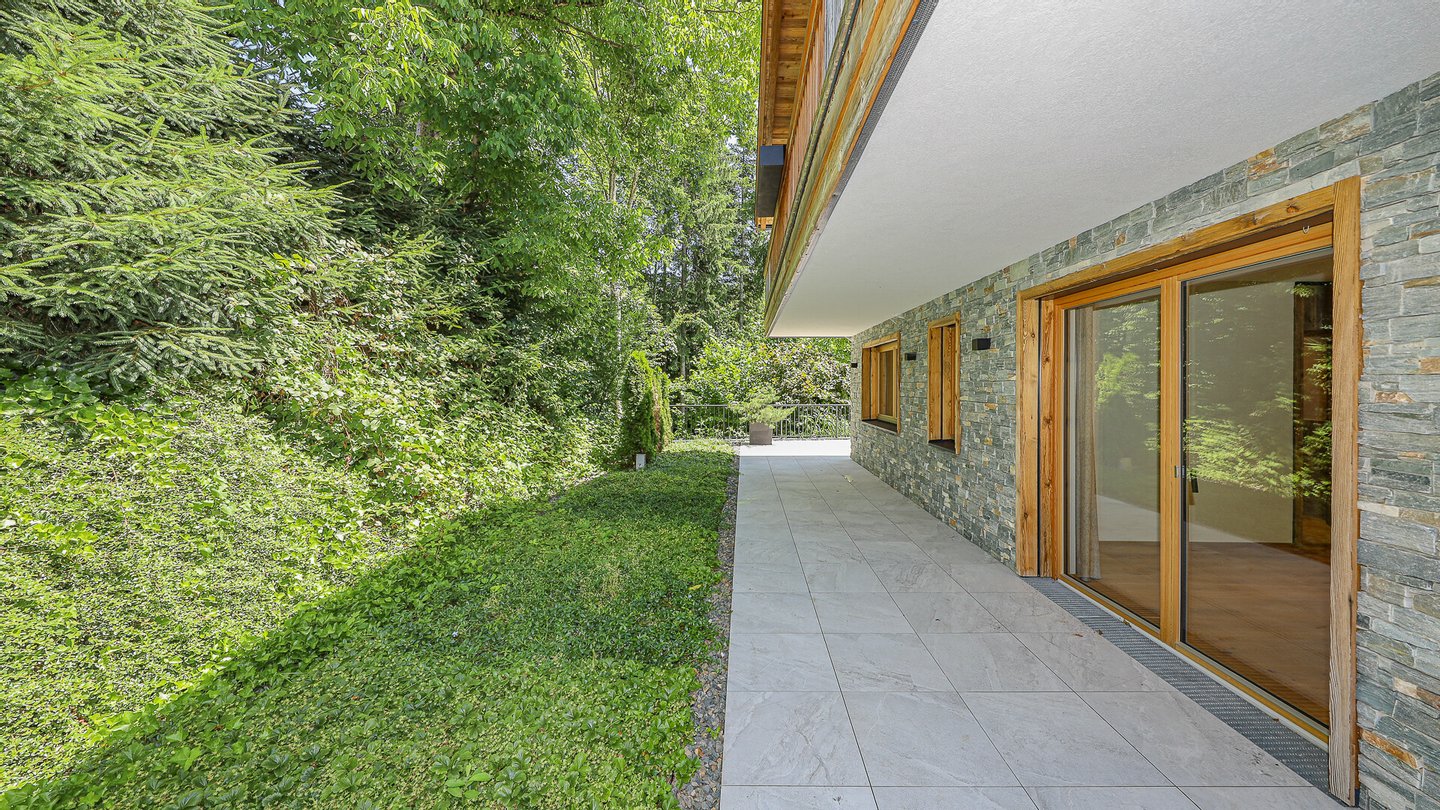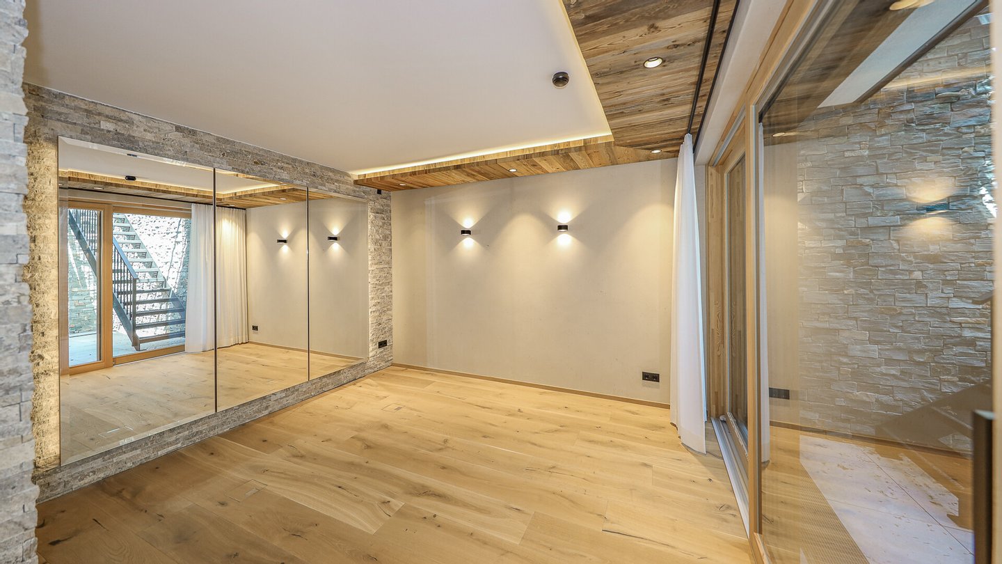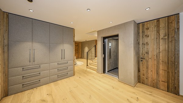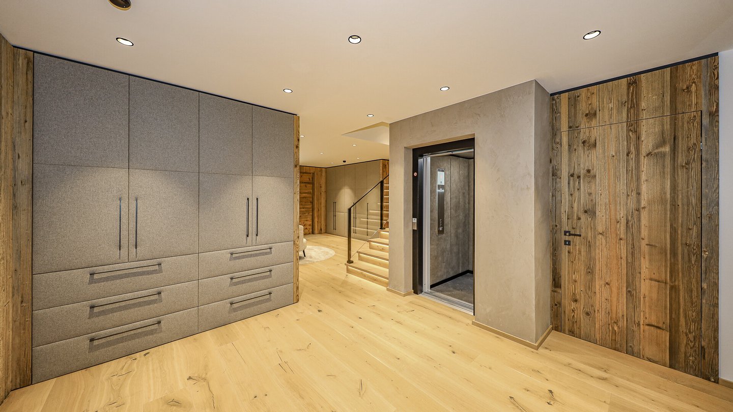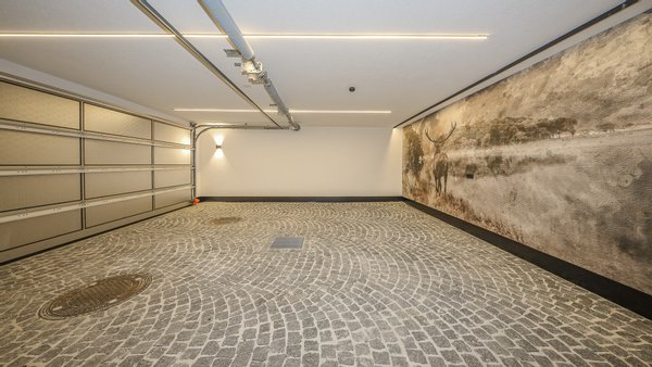 Dieses Chalet teilt sich wie folgt auf: Im Untergeschoss gelangt man über eine repräsentative Privatzufahrt direkt in die großzügige Doppelgarage dieses Hauses.
