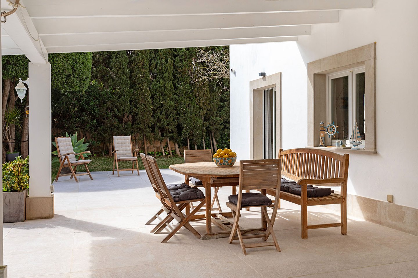 Der Außenbereich ist großzügig angelegt und von mehreren Terrassen umgeben, die vielfältige Rückzugsorte bieten. Die etwa 30 m² große, überdachte Veranda schafft einen schattigen Platz mit Blick auf den Pool und den pflegeleicht gestalteten Garten mit automatischem Bewässerungssystem und weitläufigen Rasenflächen.