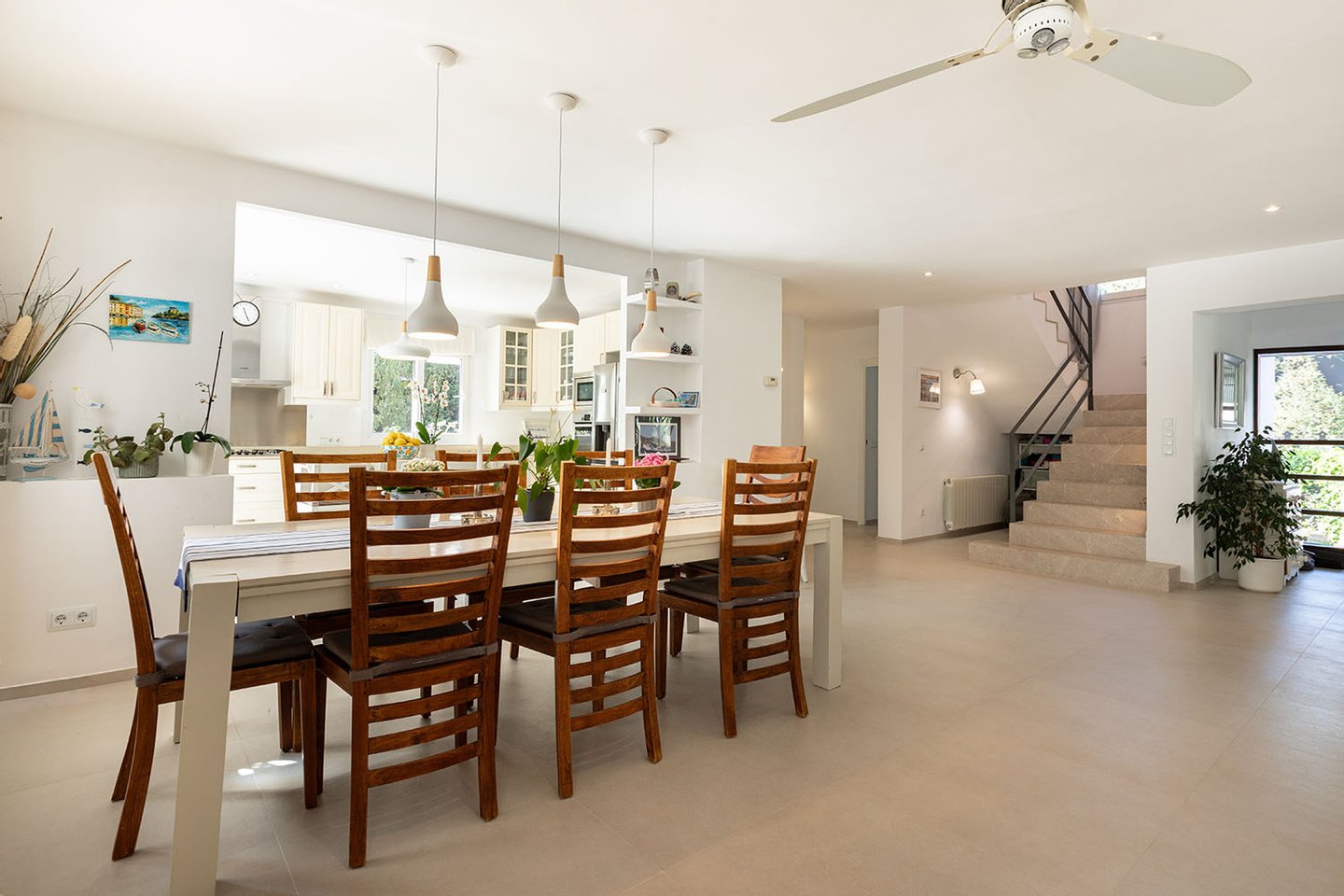 Auf einem ebenen Grundstück von ca. 1.070 m² erstreckt sich die Villa mit rund 250 m² Wohnfläche über zwei Etagen. Die Raumaufteilung ist durchdacht, hell und funktional gestaltet. Herzstück des Hauses ist der offen konzipierte Wohn- und Essbereich, der direkt auf die Terrasse und eine gemütliche, überdachte Veranda übergeht. Von hier aus öffnet sich der Blick in den Garten und zum Poolbereich, wodurch Innen- und Außenleben harmonisch miteinander verschmelzen.