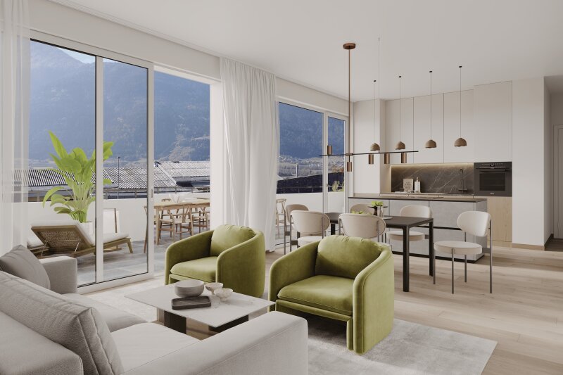 Der offene Wohn- und Essbereich beeindruckt mit klarer, moderner Architektur, edlen Materialien und großzügigen Glasfronten, die das Penthouse in helles, warmes Licht tauchen. Die Küche ist elegant integriert, das Badezimmer modern und stilvoll gestaltet – alles durchdacht für komfortables, zeitgemäßes Wohnen.