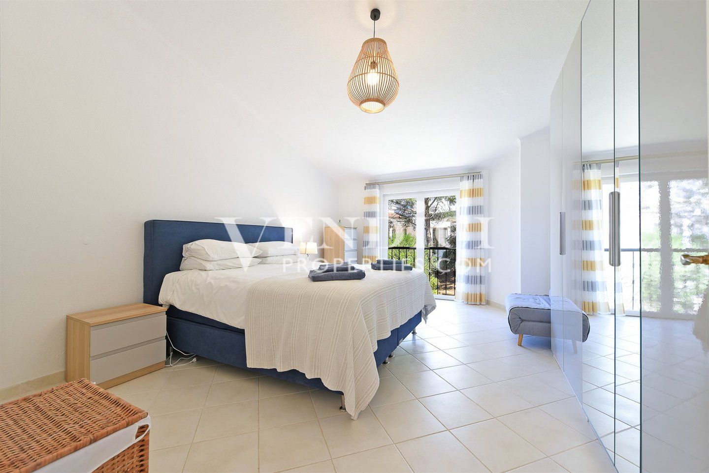 Die Wohnung umfasst zwei gut proportionierte Schlafzimmer. Das Hauptschlafzimmer ist besonders geräumig, und das zweite profitiert vom direkten Zugang zu einer privaten Terrasse, was eine ruhige Rückzugsmöglichkeit schafft. Beide Schlafzimmer sind hell, geschmackvoll eingerichtet und verfügen über ausreichend Stauraum.