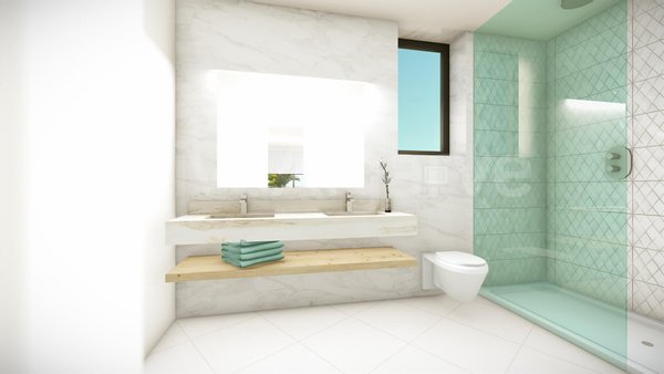 Das Haus erstreckt sich über zwei Ebenen und hat eine geplante Gesamtfläche von 200 m² auf einem Grundstück von 268 m². Der Grundriss ist auf räumliche Ökonomie und Fluss ausgelegt. Das Erdgeschoss bietet eine nahtlose Integration von Wohnen, Essen und Küche, eingerahmt von großflächigen Glasflächen, die natürliches Licht hereinlassen und direkten Zugang zur Pool-Terrasse ermöglichen. Diese Ebene verfügt auch über eine separate Speisekammer, ein Gäste-WC und ein Schlafzimmer mit eigenem Bad, was flexible Unterbringung für Gäste oder Mehrgenerationen-Wohnen ermöglicht.