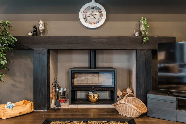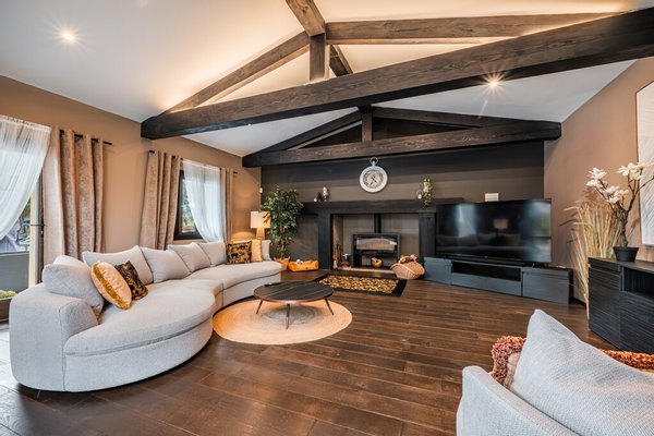Die hochwertig ausgestatteten Innenräume verfügen über massive Holztüren und Fenster. Ein großes Glasatrium sorgt für viel Tageslicht in Wohn- und Essbereich. Das geräumige Wohnzimmer hat einen Holzofen, die voll ausgestattete Küche eine separate Speisekammer und einen angrenzenden Essbereich. Der Keller eignet sich ideal als Lagerraum oder Fitnessraum.