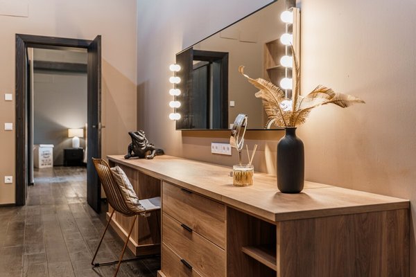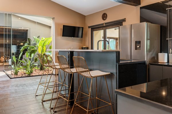 Das einstöckige Haus bietet vier Doppelzimmer, jeweils mit eigenem Bad und Einbauschränken. Das Hauptschlafzimmer verfügt über einen begehbaren Kleiderschrank, einen Abstellraum, eine separate Dusche und eine freistehende Luxusbadewanne. Zudem gibt es ein Büro und einen Hauswirtschaftsraum. Das vierte Schlafzimmer eignet sich ideal für Gäste und hat ein eigenes Bad sowie eine private Terrasse mit Blick auf die gepflegten Gärten.