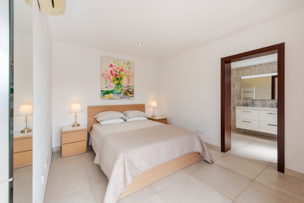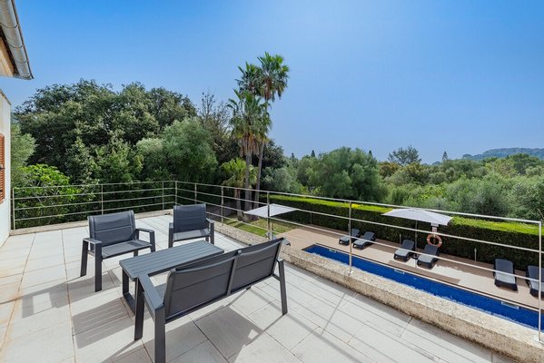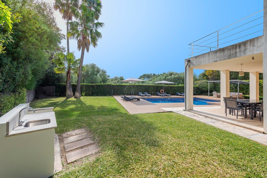 Im Außenbereich bietet die Villa einen attraktiven privaten Swimmingpool mit großzügigen Sonnenterrassen, die sich perfekt eignen, um die Sonne Mallorcas zu genießen. Eine schattige Ess-Terrasse und ein gemauerter Grillbereich bieten den idealen Rahmen für Mahlzeiten im Freien, während eine stilvolle Pergola mit Chill-out-Sitzgelegenheiten einen entspannenden Ort am Pool schafft.