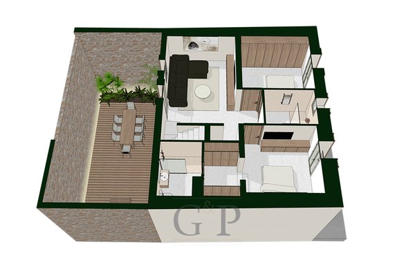 Im Erdgeschoss betreten Sie die Immobilie und gelangen in eine großzügige, offen gestaltete Wohnküche mit direktem Zugang zum Wohnzimmer. Von hier aus öffnet sich der große, private Innenhof – ein idealer Ort zum Entspannen und Genießen. Zudem befinden sich auf dieser Ebene eine Garage, ein Gäste-WC sowie ein kleiner Keller, der sich hervorragend zur Unterbringung von Fahrrädern oder Golfbags eignet.
