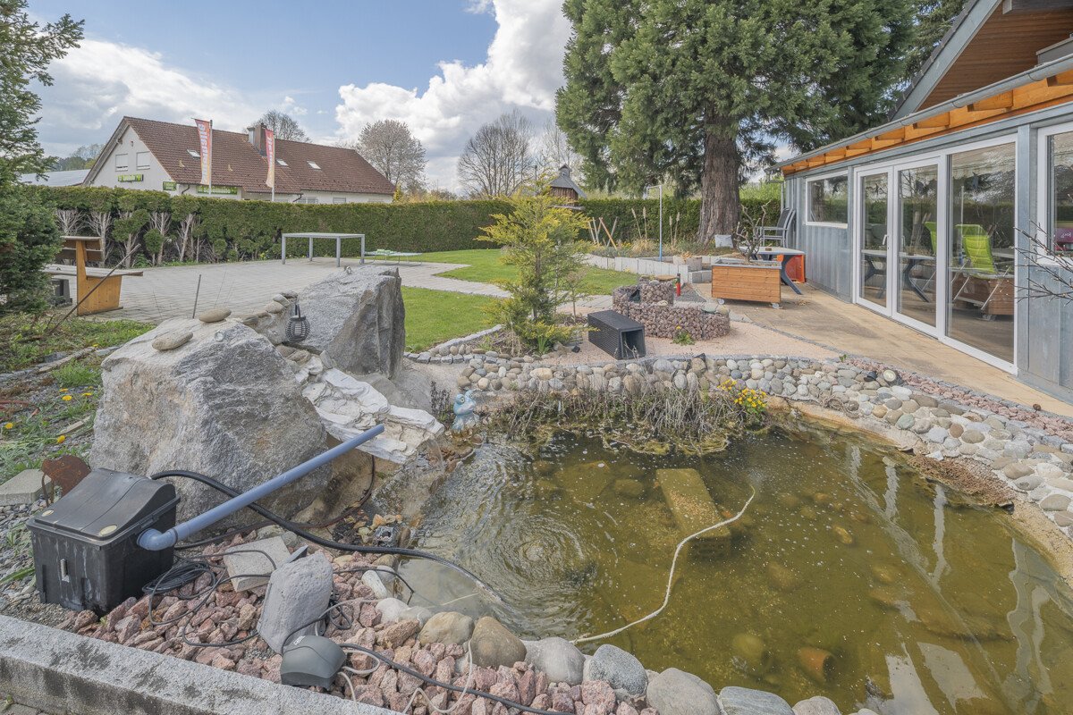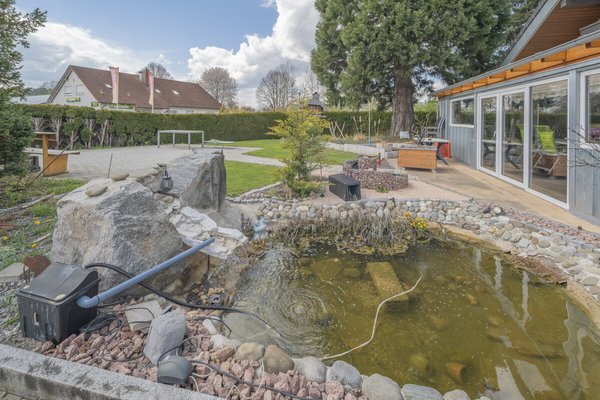 Der Außenbereich überzeugt mit großem Garten, Teich und Biotop – eine seltene Kombination, die sowohl Erholung als auch repräsentative Möglichkeiten bietet.