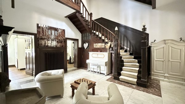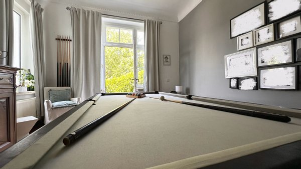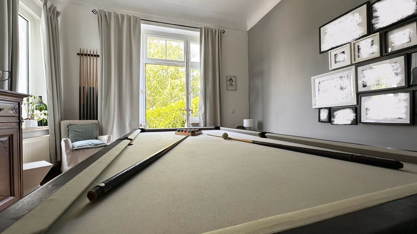 Im 1. Obergeschoss erwartet Sie ein XL-Wohnbereich mit Kamin, daneben eine Wohnküche, eine traumhafte Bibliothek und erwartungsgemäß ein Herrenzimmer mit Billardtisch und Kachelofen. Von hier aus gelangen Sie auch auf die Dachterrasse mit Blick in den Garten. Ein weiteres Badezimmer rundet die Etage ab.