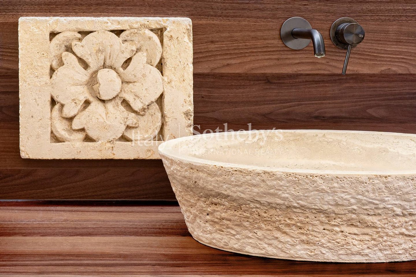 Der großzügige Wohnbereich mit Kamin aus Travertinmarmor und zwei Balkonen wird durch eine offene Küche mit Weinkühler ergänzt. Helle Räume und ausgewogene Proportionen prägen das Interieur. Der Schlafbereich umfasst eine Master-Suite mit Türkischem Bad sowie zwei weitere Schlafzimmer mit eigenen Bädern und ruhigen Innenausblicken.