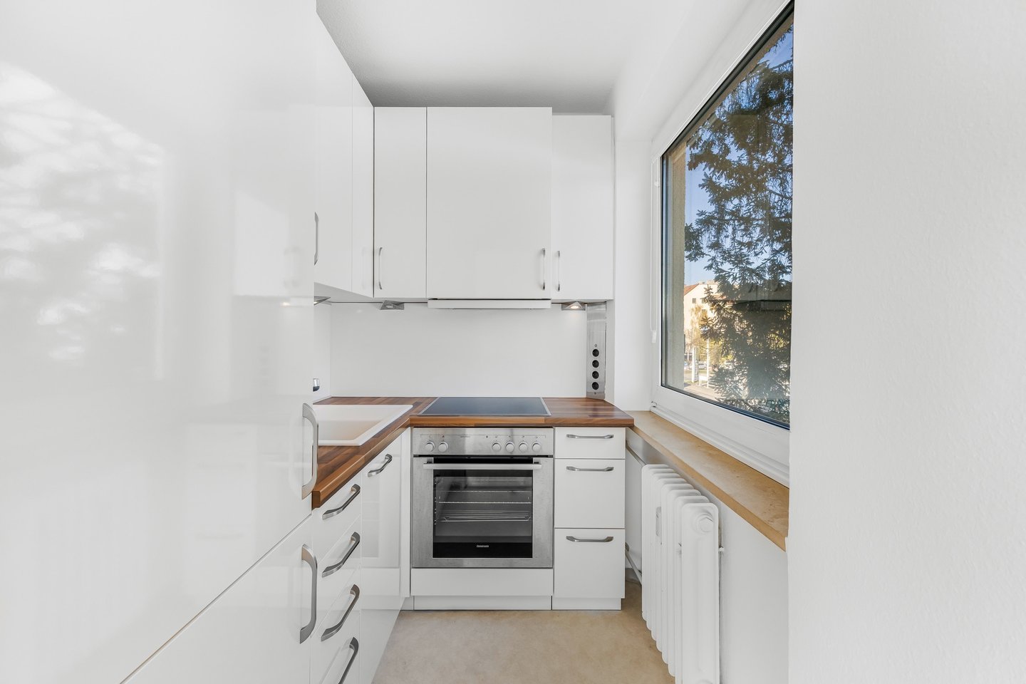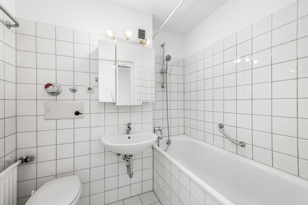 Die separate Kochnische ist funktional abgetrennt und mit einer gepflegten Einbauküche ausgestattet. Ein Fenster sorgt hier für Tageslicht und gute Belüftung. Das separate und großzügige Schlafzimmer ermöglicht eine angenehme Rückzugsmöglichkeit. Das innenliegende Badezimmer verfügt über eine Badewanne.