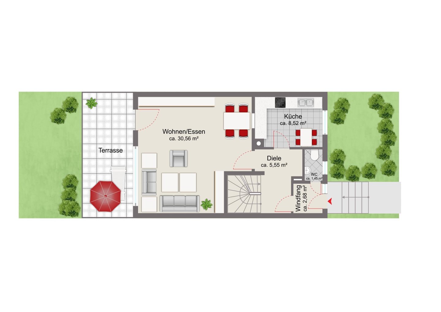 Das Erdgeschoss verfügt klassisch über die Küche, ein Gäste-WC sowie den geräumigen Wohn- und Essbereich mit Zugang zu Terrasse und Garten. Dies schafft ein einladendes Raumgefühl – perfekt für gemütliche Abende oder gesellige Stunden mit Freunden und Familie.