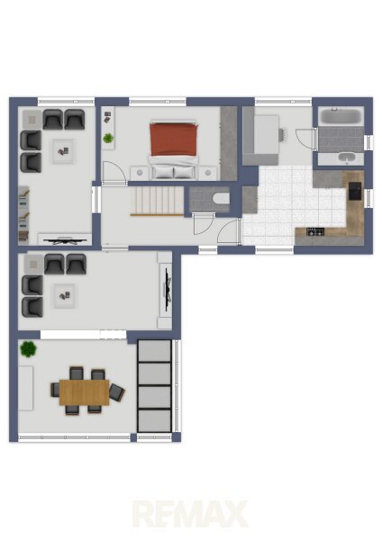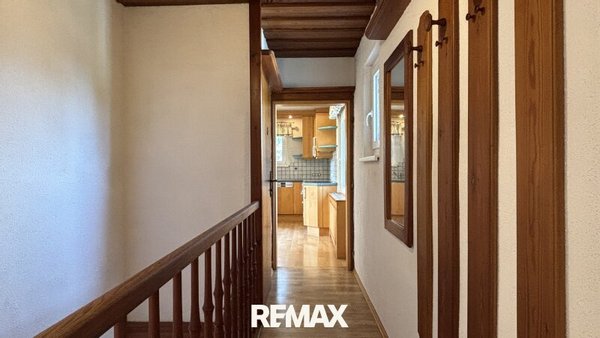 Über eine Treppe erreicht man das Obergeschoss, das ebenfalls über eine Küche mit Essbereich verfügt. Hier befinden sich drei weitere Zimmer, die flexibel genutzt werden können und somit ausreichend Platz für die gesamte Familie bieten. Ein Badezimmer mit Badewanne rundet das Raumangebot im Obergeschoss ab.