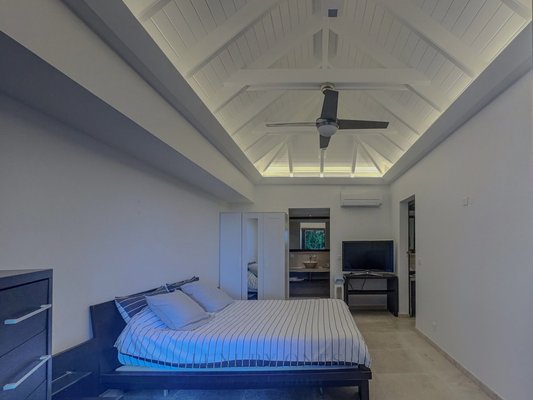Die Hauptvilla verfügt über zwei geräumige Schlafzimmer, jedes mit einem Duschraum aus feinem Stein und hochwertigem Holz. Die Zimmer öffnen sich auf eine Terrasse und ein Schwimmbecken, was einen wunderschönen Blick aufs Meer bietet. Das große Wohnzimmer mit einem Fernsehbereich und einer voll ausgestatteten offenen Küche verbindet sich durch große Fenster mit der Terrasse.