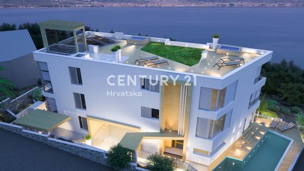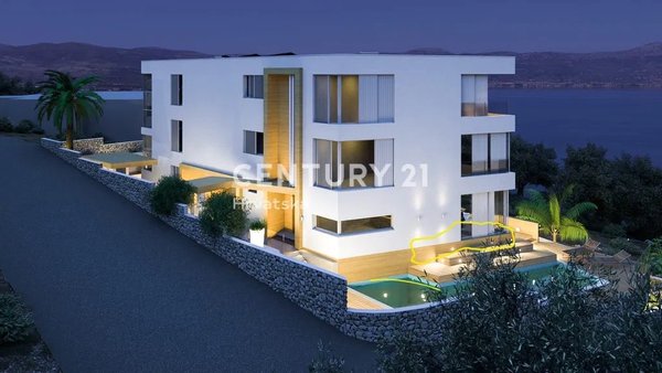 Die erste und größte dreistöckige Wohnung mit 229 m² besteht aus einem großen Wohnzimmer, einer Küche und drei Schlafzimmern. Jedes Zimmer hat seinen eigenen Kleiderschrank und ein eigenes Badezimmer. Die Wohnung verfügt außerdem über eine zusätzliche vierte WC. Zu den luxuriösen Ausstattungsmerkmalen dieser Wohnung gehören eine Sauna, ein Hallenbad und ein beheiztes Außenbecken. Jede Etage bietet einen Meeresblick. Diese Wohnung verfügt über 4 Parkplätze in der Garage.