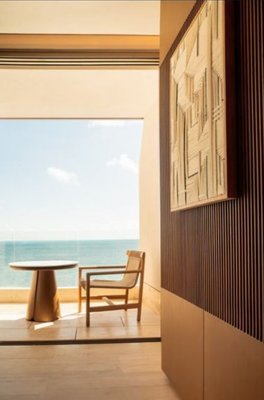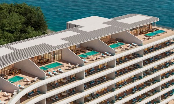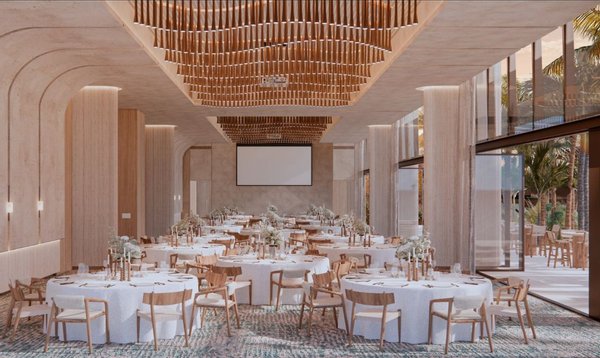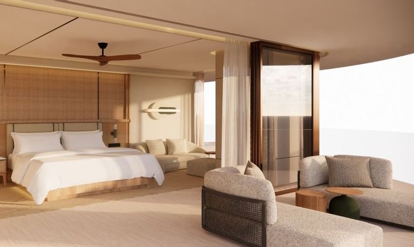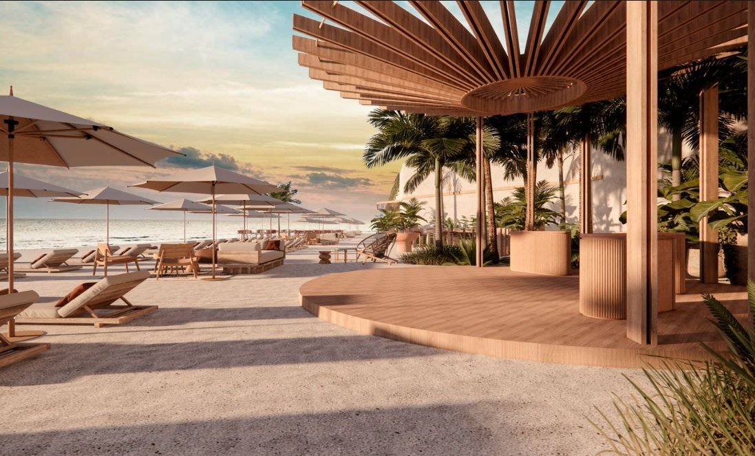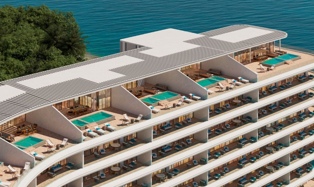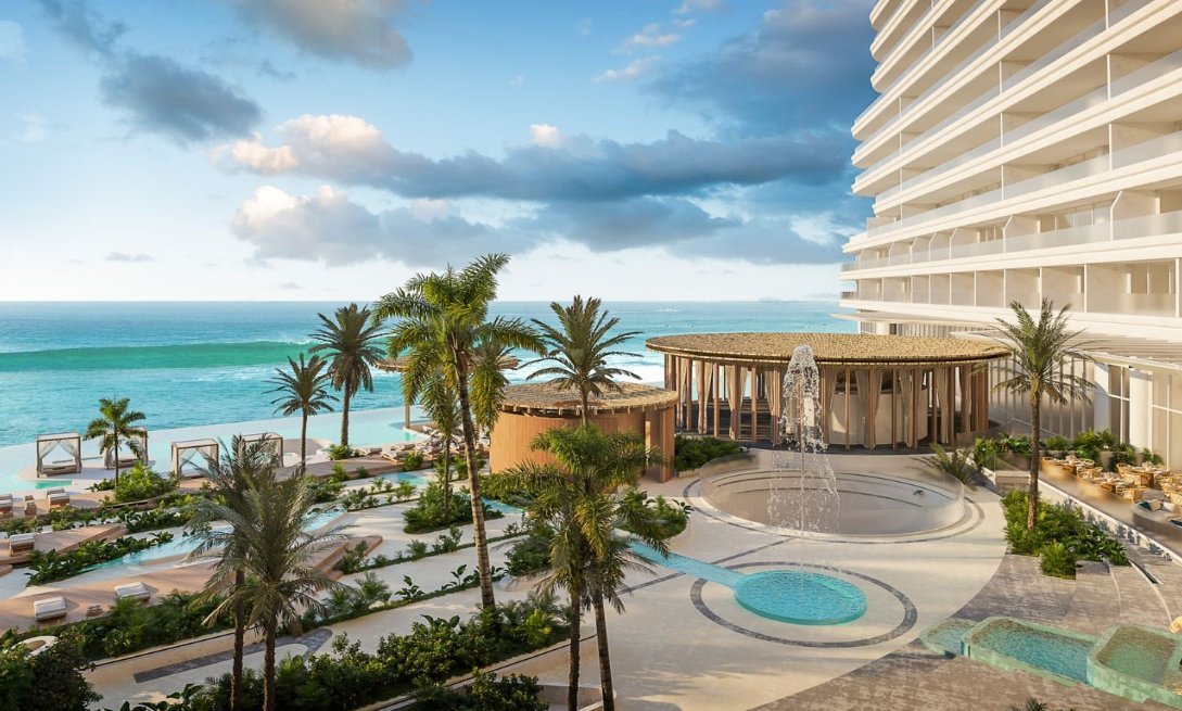 open social areas, floor-to-ceiling windows, and a terrace that blends into the Caribbean.