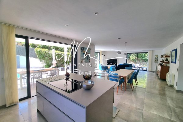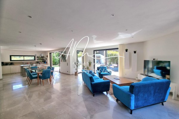 Cavalier liegt eingebettet in das Grün dieses modernen Hauses ohne jegliche Ergänzung von 180 m² und ist nach Süden ausgerichtet, mit Schwimmbad und Garage – es bietet nämlich eine Eingangshalle, die auf ein schönes Wohnzimmer/Wohnzimmer mit