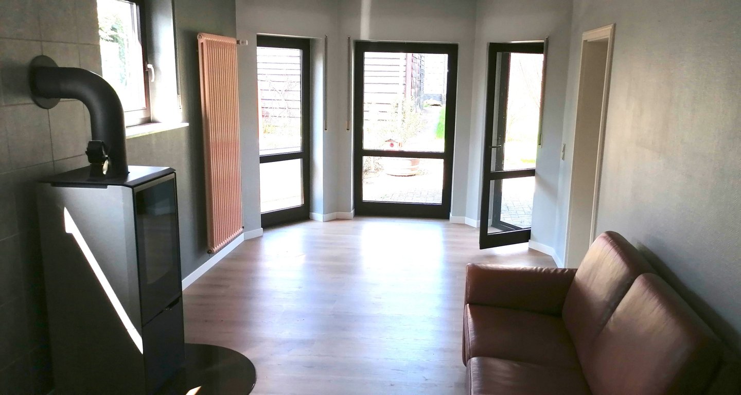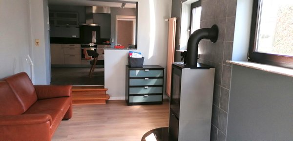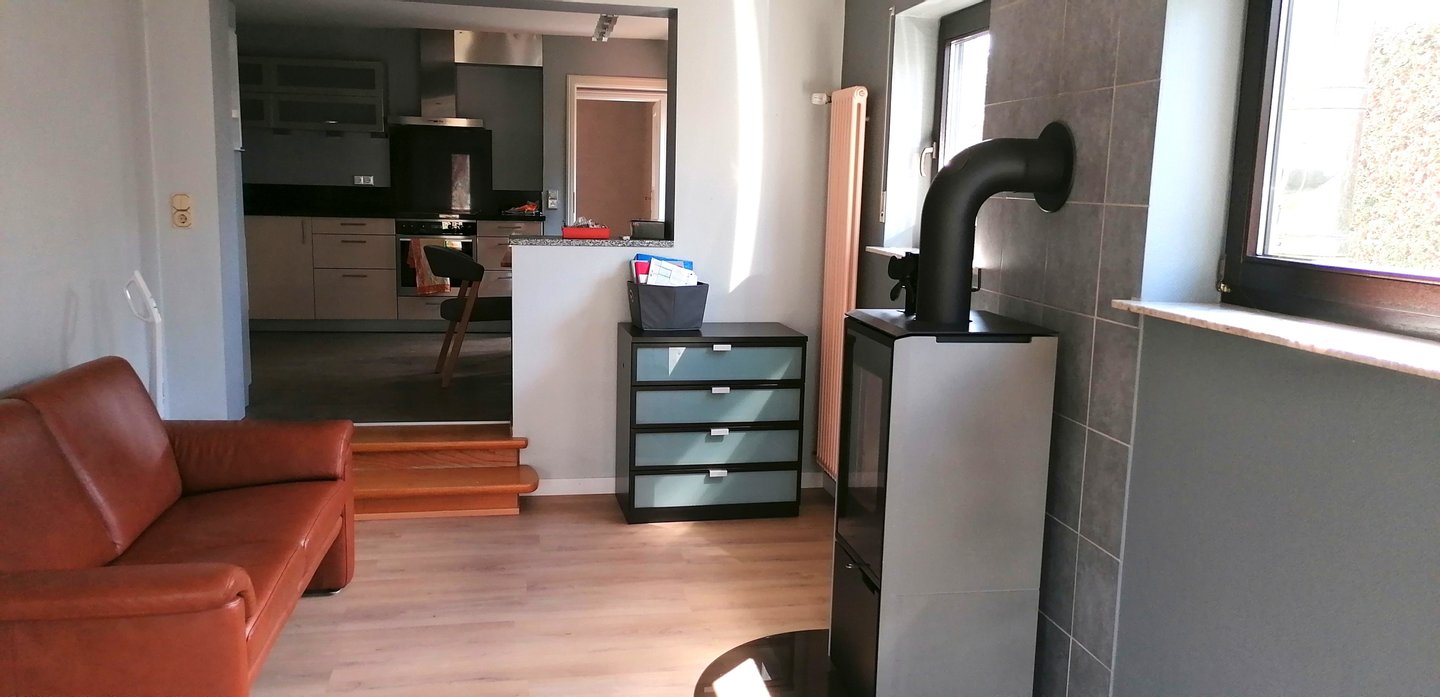 Der Wohnbereich überzeugt durch seine einladende Atmosphäre und wird durch einen modernen Holzofen mit Edelstahlkamin ergänzt, der für behagliche Wärme und ein angenehmes Wohngefühl sorgt. Der angrenzende Essbereich bietet ausreichend Platz für gemeinsame Mahlzeiten und gesellige Abende.