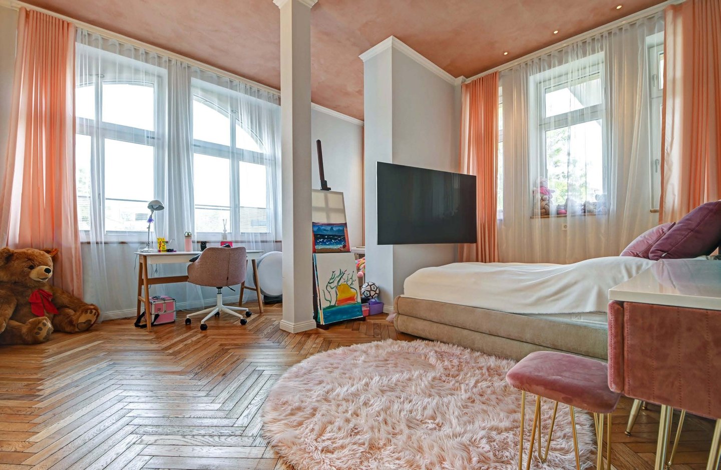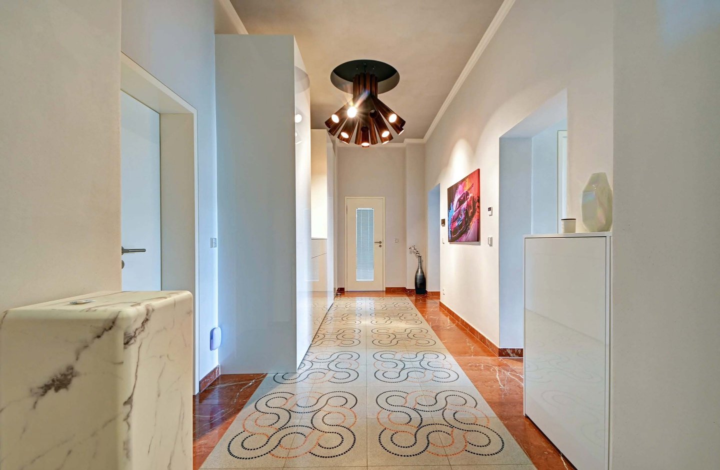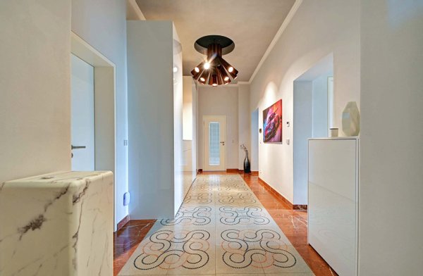 Über die Diele, ausgestattet mit wunderschönen Fliesen, erreichen Sie sämtliche Zimmer. Das erste Schlafzimmer lässt sich als Kinder-, Arbeits- oder Gästezimmer nutzen. Bevor Sie dieses erreichen, biegen Sie rechts in ein Bad mit Marmorboden,