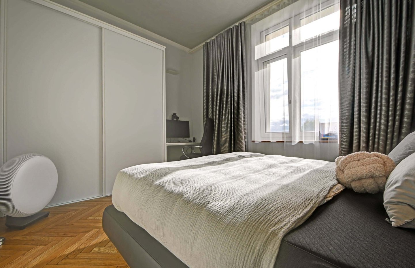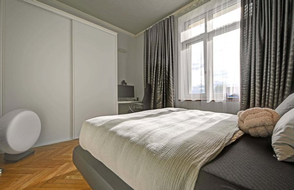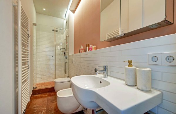 Über die Diele, ausgestattet mit wunderschönen Fliesen, erreichen Sie sämtliche Zimmer. Das erste Schlafzimmer lässt sich als Kinder-, Arbeits- oder Gästezimmer nutzen. Bevor Sie dieses erreichen, biegen Sie rechts in ein Bad mit Marmorboden, Dusche, Bidet, WC sowie einem Spiegelschrank für ausreichend Ablagefläche ab.