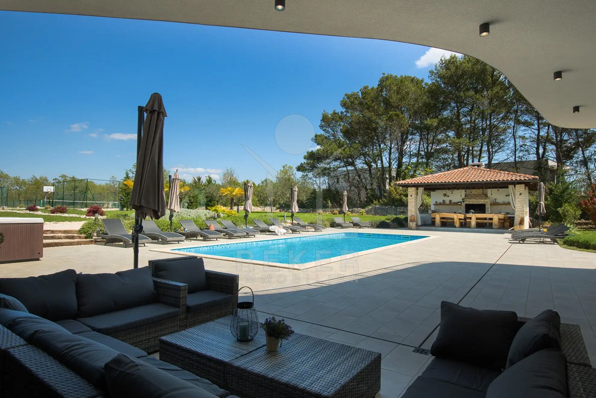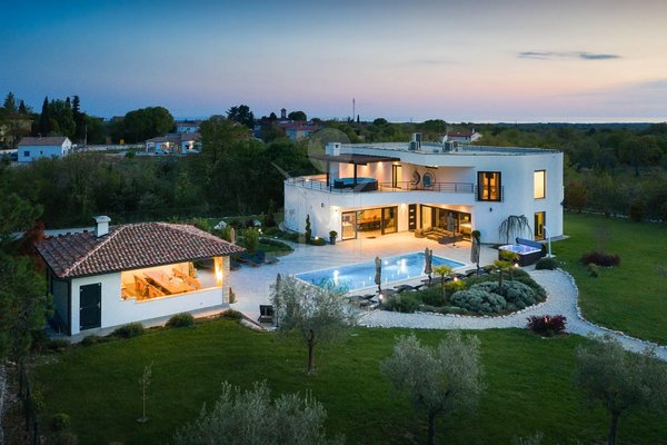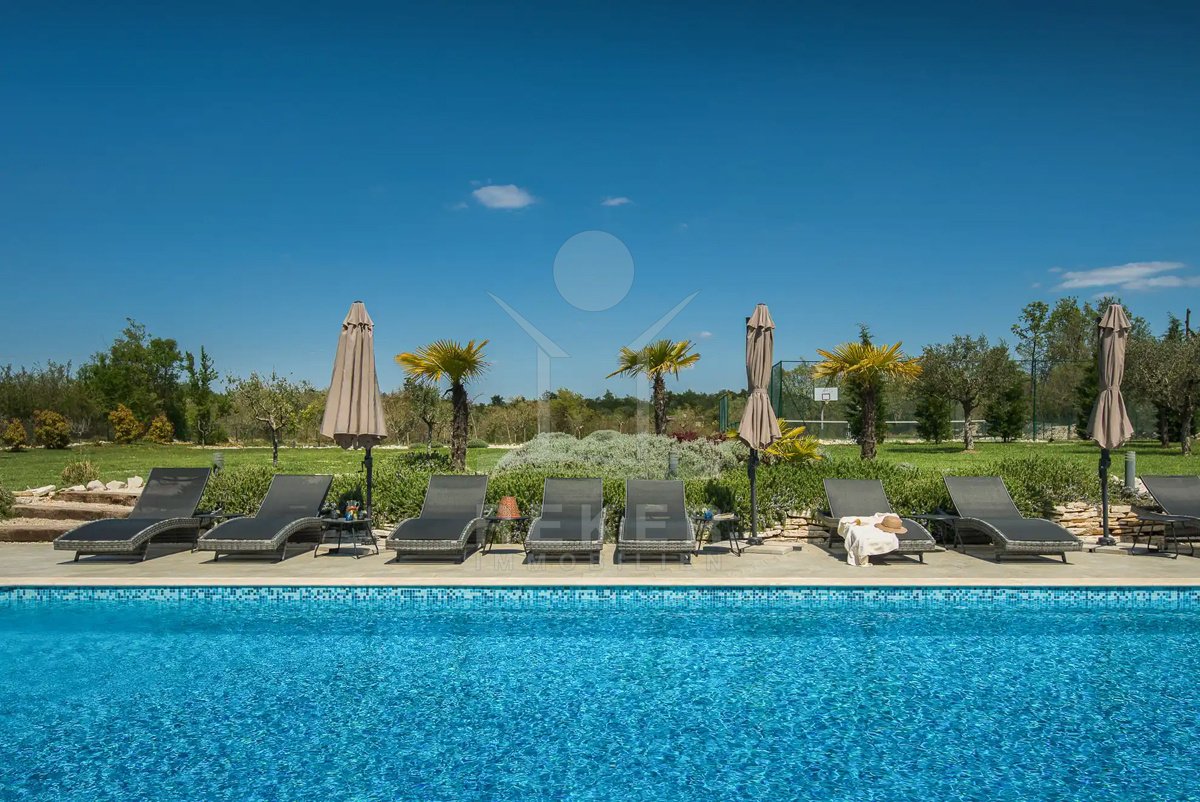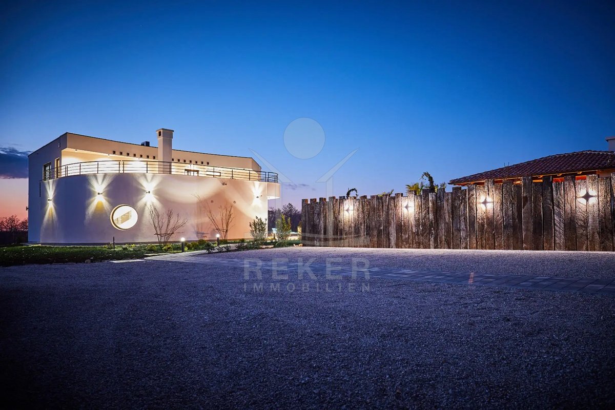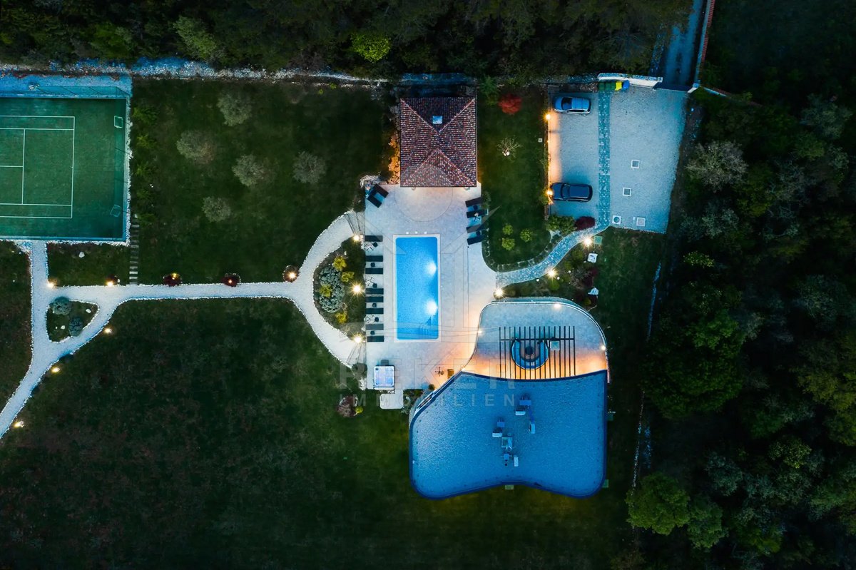 Diese Villa befindet sich nahe Svetvinčenat, im unberührten Süden Istriens. Sie genießen hier viel Ruhe und Natur. Gleichzeitig erreichen Sie Pula, Rovinj und Poreč auf gutem Weg. Das rund 10.000 m² große Anwesen ist komplett eingezäunt, aufwendig gestaltet und bietet ein hohes Maß an Privatsphäre. Schon die Zufahrt setzt den Ton: Ein automatisches Tor führt auf das Grundstück. Dort stehen sichere Stellplätze für bis zu 6 Fahrzeuge und eine Wallbox für Elektroautos bereit.