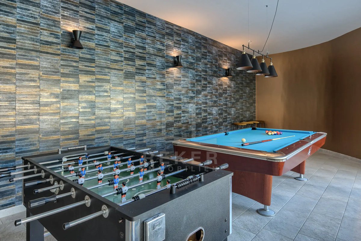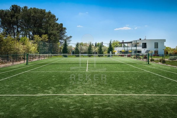 Der Außenbereich wirkt wie ein privater Ferienort. Die große, keramisch geflieste Terrasse führt direkt zum beheizten Pool mit ca. 50 m². Hinzu kommen ein Whirlpool für 5 Personen, eine Außendusche, hochwertige Sonnenliegen und mehrere Essbereiche im Freien. Ein Sommerhaus, ein großer BBQ-/Außenofen, mediterrane Gartenflächen mit Olivenhain und Palmen sowie die vollständig eingefriedete Anlage runden das Bild stimmig ab. Dazu kommen starke Freizeitangebote auf dem eigenen Grundstück: ein multifunktionaler Sportplatz für Tennis, Fußball und Basketball, Badminton, Minigolf mit 9 Löchern sowie weitere großzügige Flächen im Freien. Ein Pluspunkt für Familien, Gäste und die Ferienvermietung.
