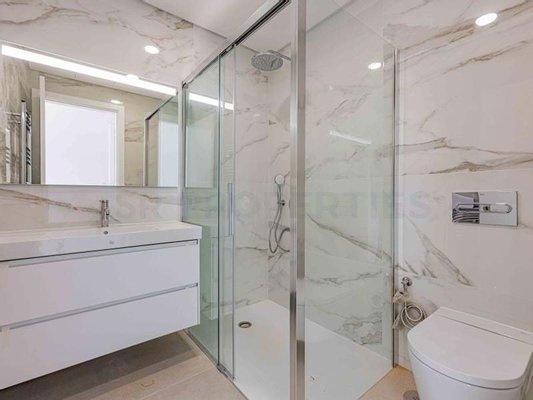 Die offene Küche mit Wohnzimmer, Bosch-Geräten und Doppelverglasung bietet eine funktionale und anspruchsvolle Umgebung. Die beiden Schlafzimmer mit eigenem Bad gewährleisten völlige Privatsphäre und Bequemlichkeit, ergänzt durch ein Gästebad.