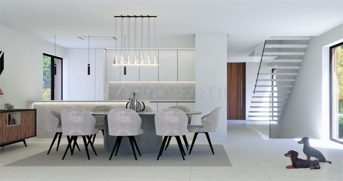 Das Haus bietet großzügige Innen- und Außenräume, darunter ein geräumiges Wohnzimmer, gut ausgestattete Küche, 4 Schlafzimmer und 4 Bäder. Große Panoramafenster lassen viel natürliches Licht herein und schaffen eine wohnliche und luftige Atmosphäre in allen Bereichen. Das Haus wird mit Klimaanlage und Fußbodenheizung ausgestattet, um ganzjährig höchsten Komfort zu gewährleisten.