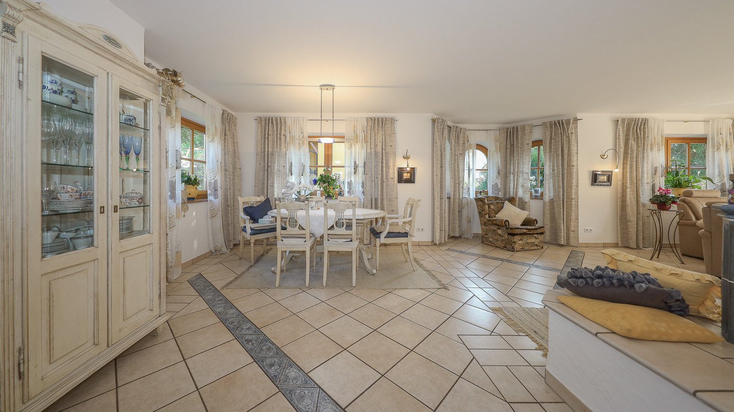 Vom großzügigen Vorplatz mit angrenzender Garage gelangt man in den Vorraum mit Garderobe und Gäste-Toilette. Weiters in den geräumigen Wohn- und Essbereich mit Kachelofen und offener Küche. Vom Wohnbereich kommt man auf die überdachte Terrasse und sodann in den umlaufenden Garten.