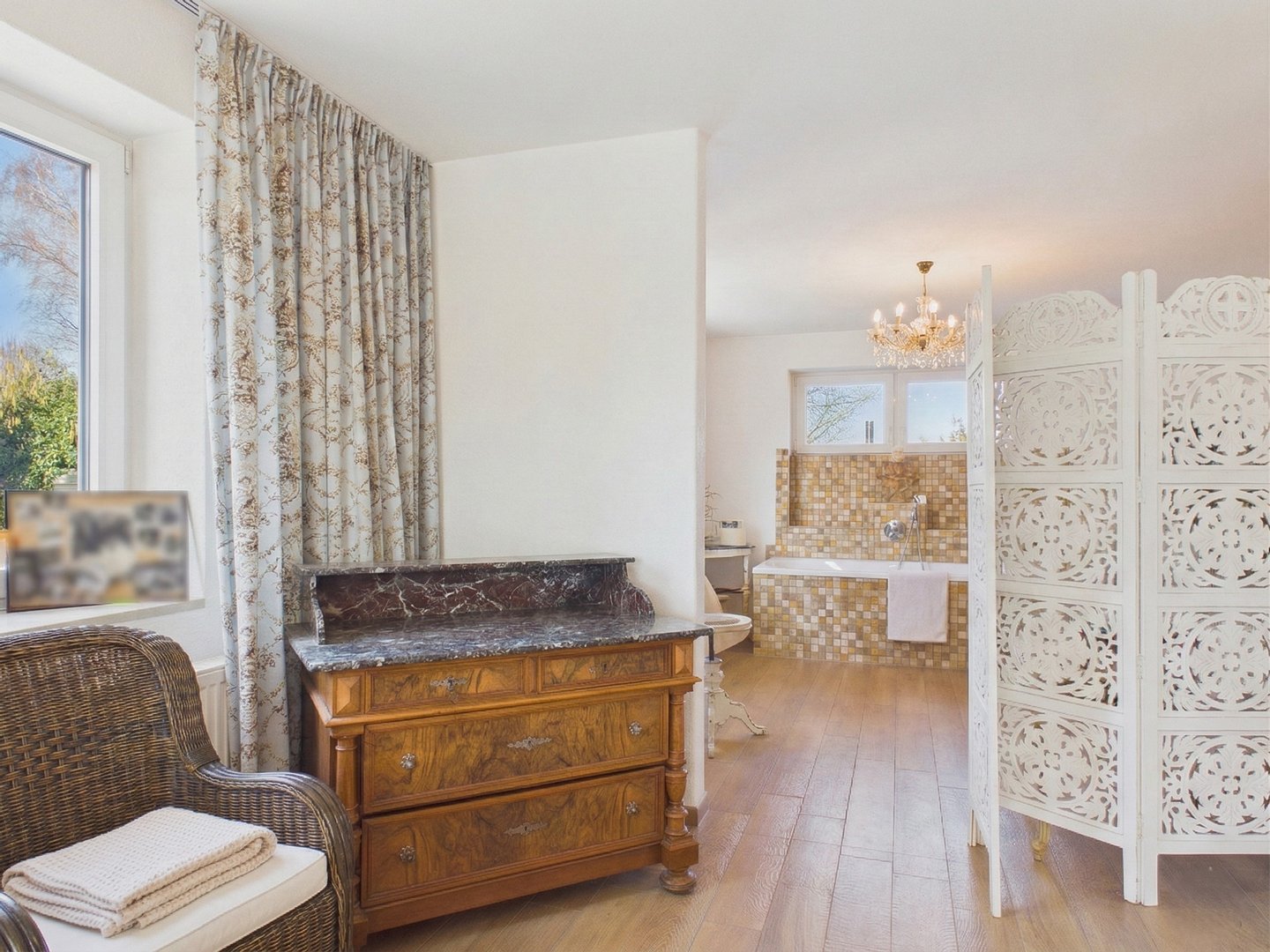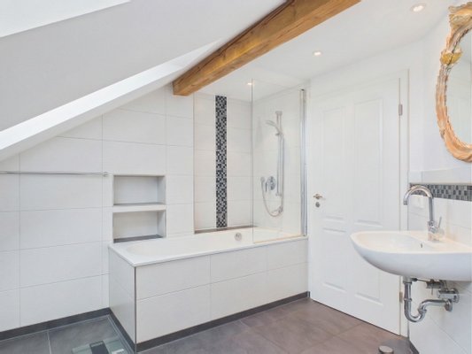 – Modernisiertes Badezimmer OG mit Fußbodenheizung, Badewanne, Dusche und Dachterrasse