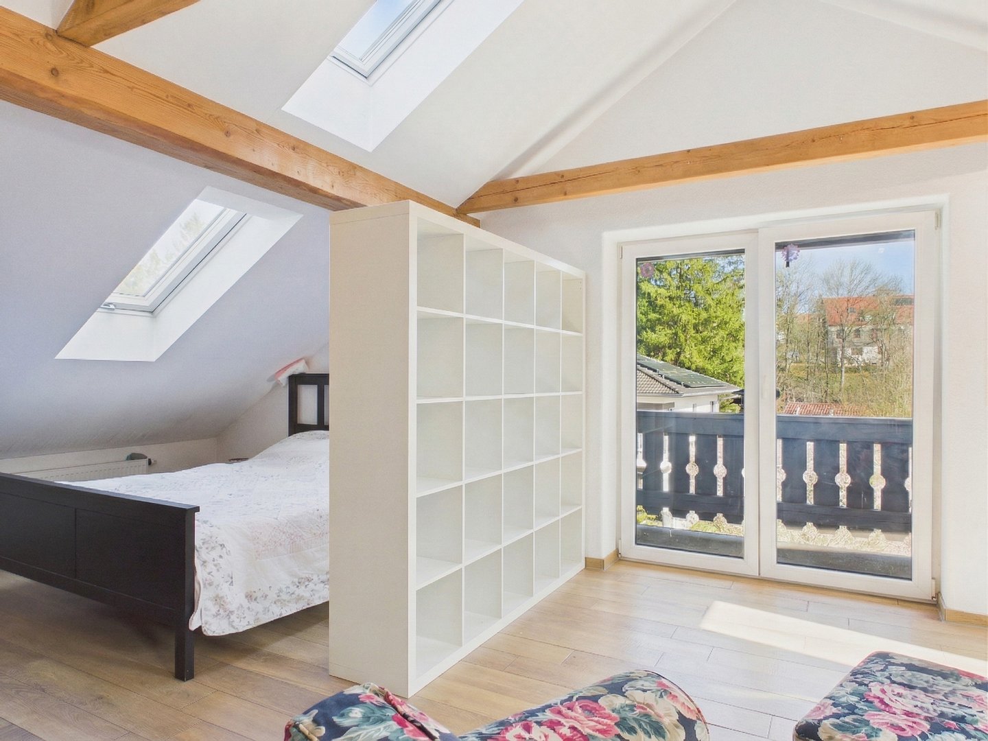 Obergeschoss: Diese Ebene besticht durch eine helle 3-Zimmer-Wohnung mit einem weitläufigen Wohn- und Essbereich, einem gemütlichen Kaminofen und einer hochwertigen Einbauküche (Miele-Geräte, Rizzoli-Ofen). Ein umlaufender Süd-Ost-Balkon sowie ein modernes Badezimmer mit Fußbodenheizung und Zugang zur Dachterrasse runden das Angebot ab.