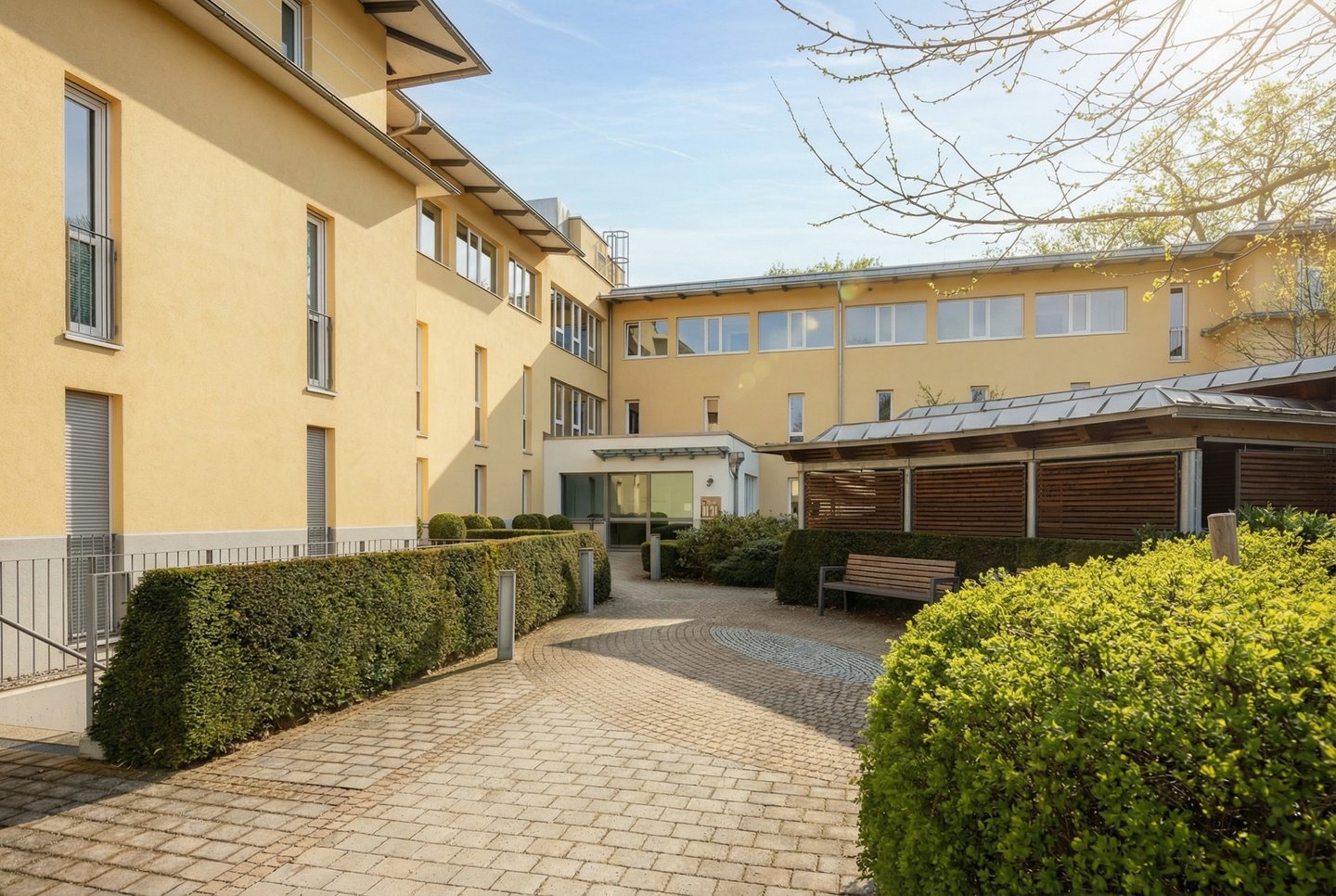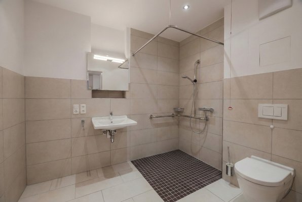 Alle wichtigen Einrichtungen des täglichen Bedarfs sind in fußläufiger Entfernung vorhanden: Supermärkte, Bäckereien, Ärzte und Apotheken sind bequem erreichbar, sodass ein selbstbestimmtes Leben problemlos möglich ist. Besonders hervorzuheben ist die Nähe zur Caritas-Einrichtung nebenan, die bei Bedarf Betreuung, Pflegeleistungen oder Unterstützung anbietet. So können Bewohner bei steigendem Pflegebedarf innerhalb der Anlage umziehen und bleiben dennoch in ihrem vertrauten Umfeld.