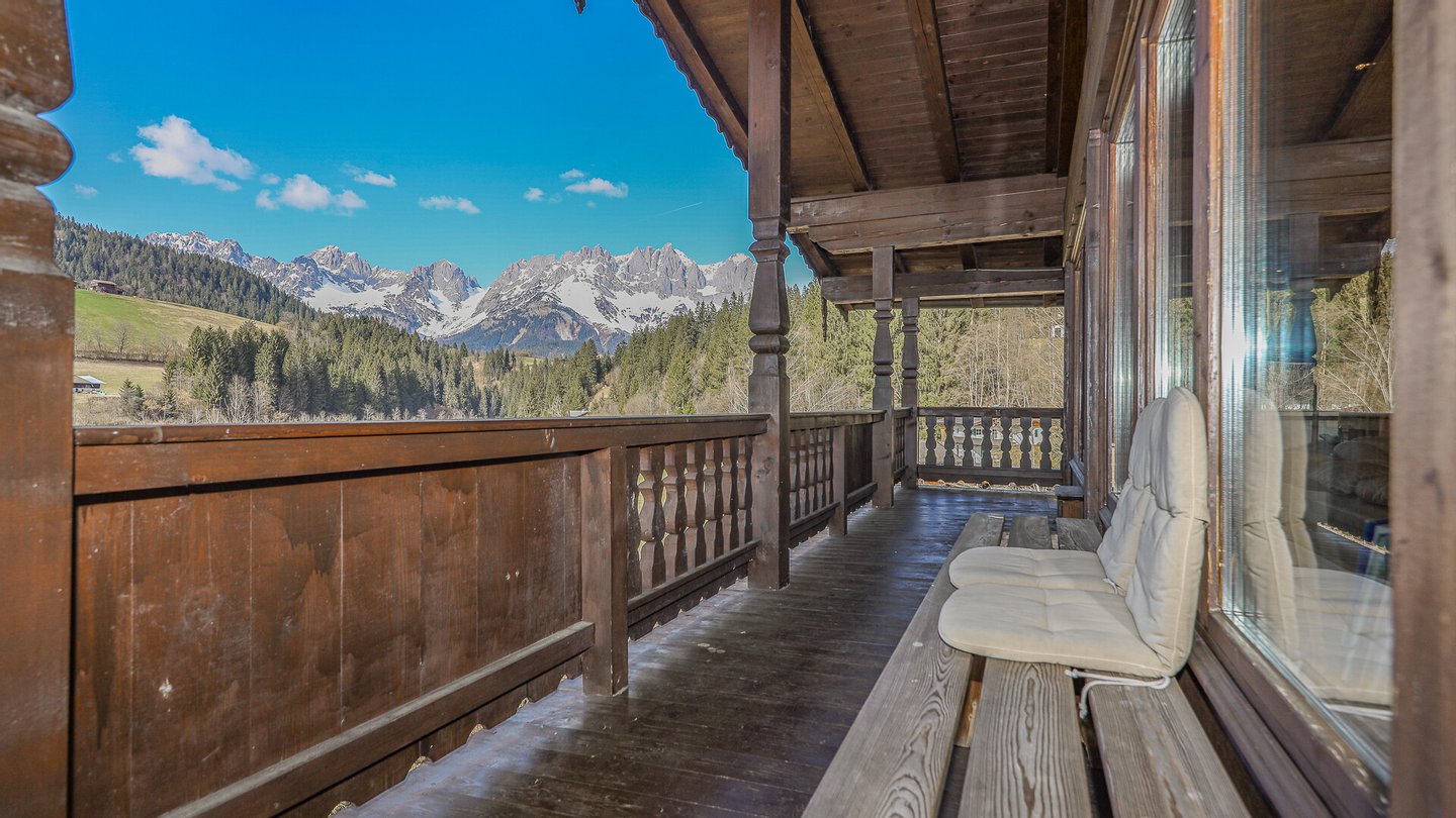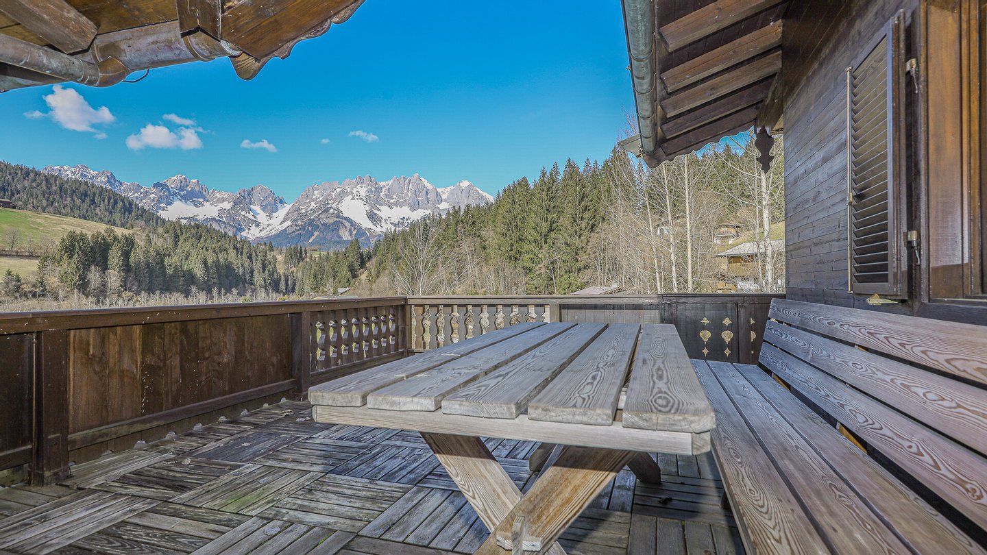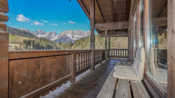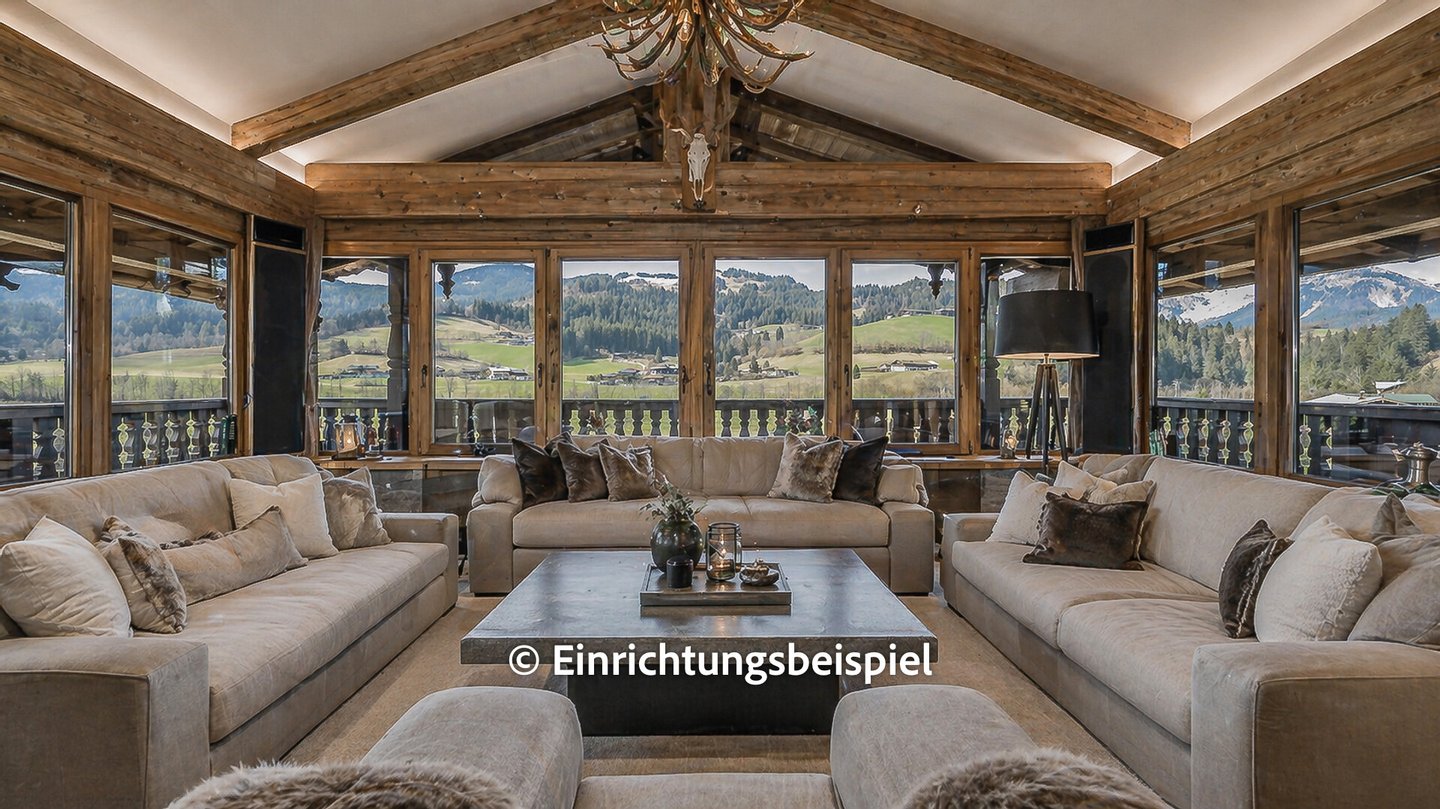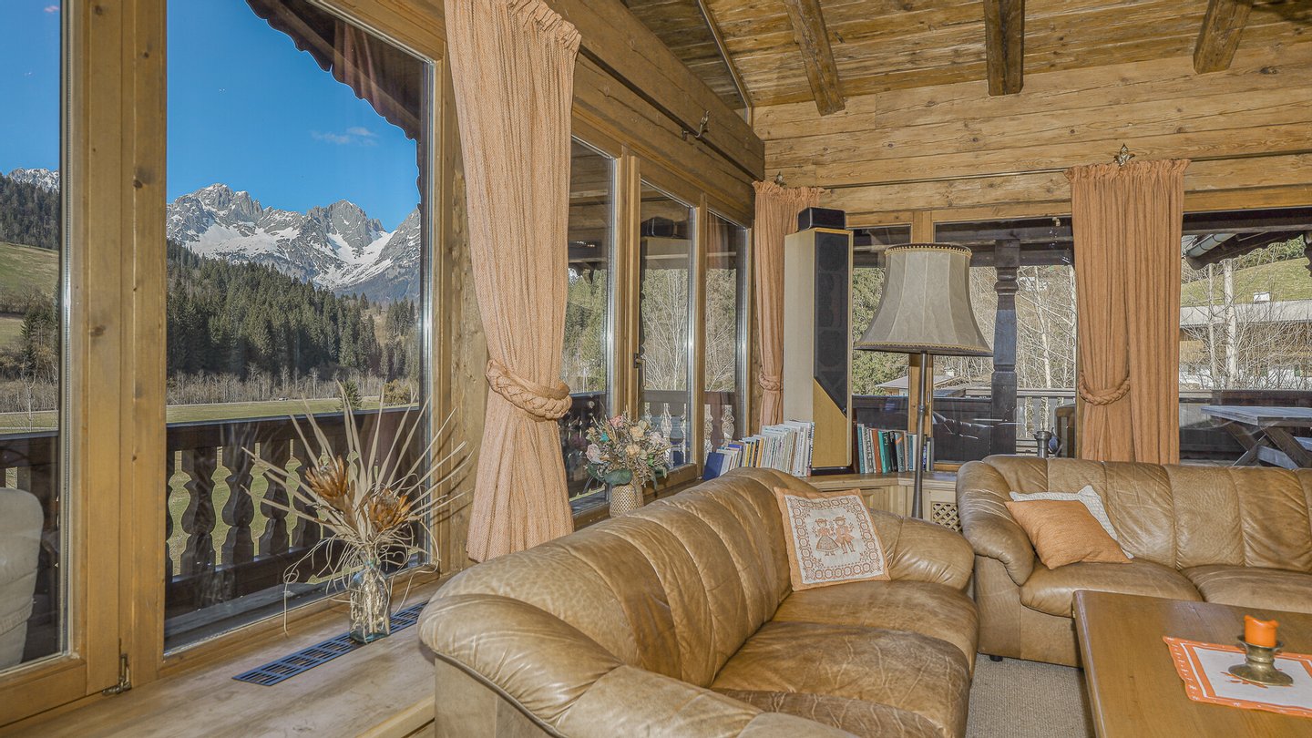 Im Dachgeschoss befindet sich ein riesiger Wohnraum mit zahlreichen Fenstern, welche den Blick auf die umliegende Bergwelt und vor allem auf den Wilden Kaiser freigeben. Ein offener Kamin und ein Kachelofen sorgen für ein angenehmes Klima.