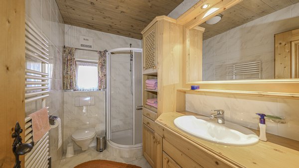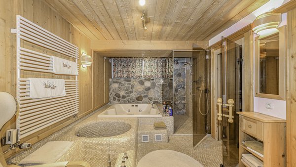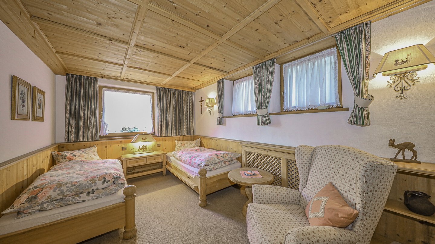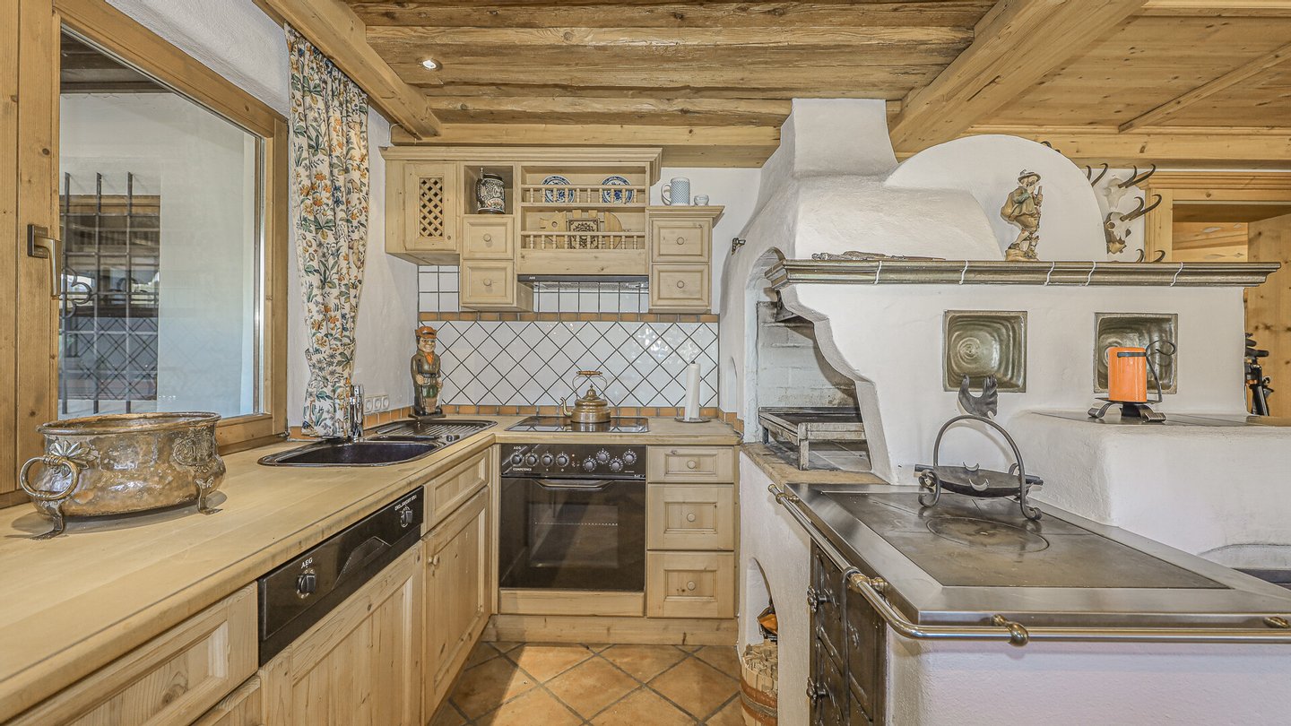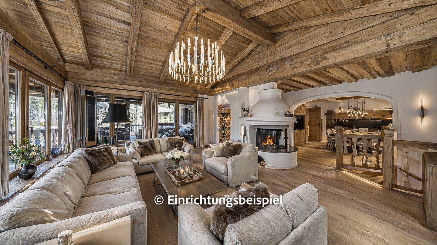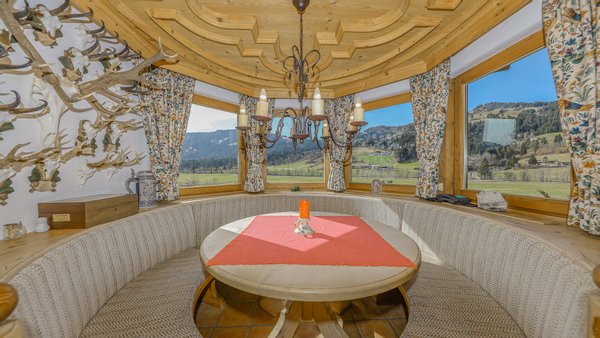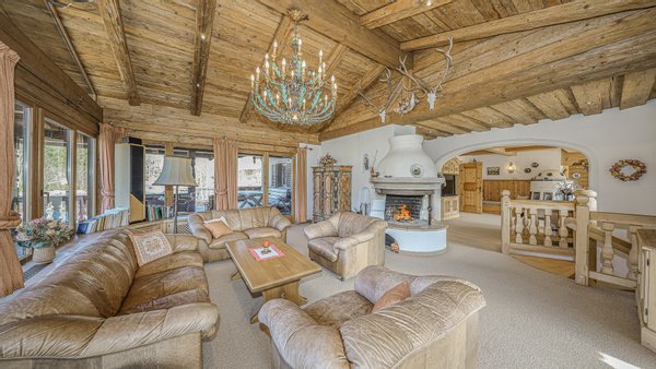 Im Dachgeschoss befindet sich ein riesiger Wohnraum mit zahlreichen Fenstern, welche den Blick auf die umliegende Bergwelt und vor allem auf den Wilden Kaiser freigeben. Ein offener Kamin und ein Kachelofen sorgen für ein angenehmes Klima.