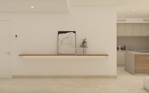 Die gehobene Ausstattung der Wohnung lässt keine Wünsche offen. Ein Highlight ist der offene Wohn- und Essbereich mit einer komplett ausgestatteten Einbauküche. Von hier aus gelangen Sie auch auf den Balkon, auf dem Sie die Sonne und die Ruhe genießen können. Die Klimaanlage sorgt auch an heißen Tagen für ein angenehmes Raumklima.