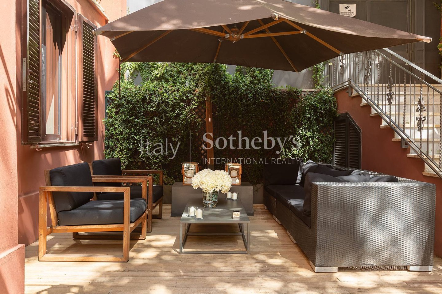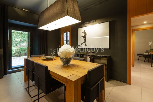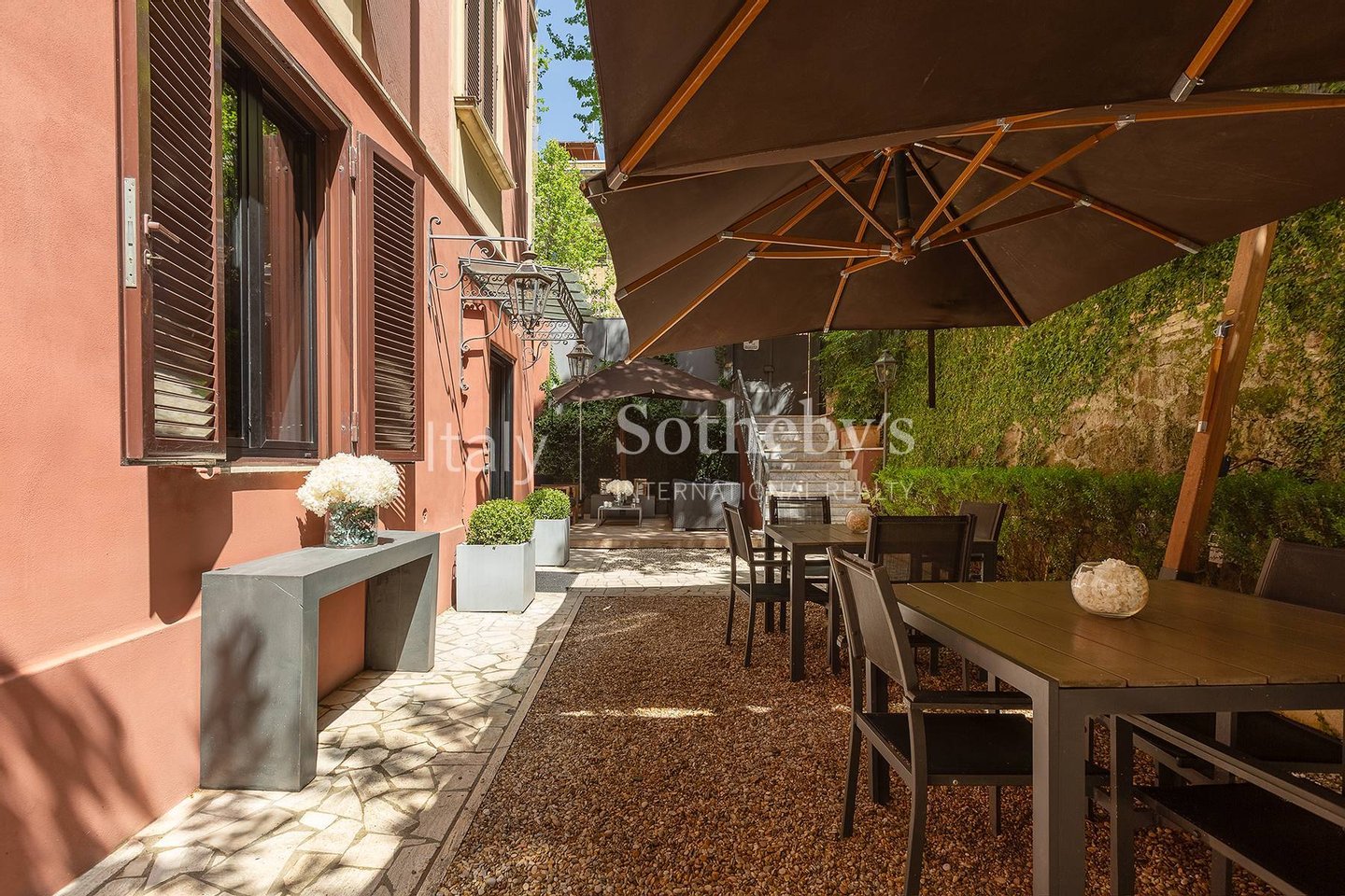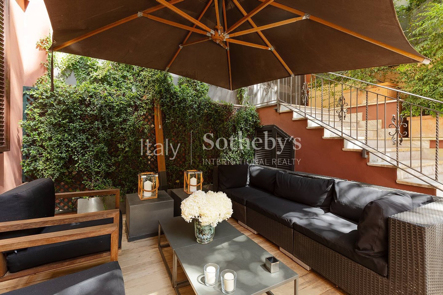 Ein gepflegter privater Garten, perfekt ausgestattet mit Lounge-Bereichen und Flächen für geselliges Beisammensein, empfängt Gäste in einer Atmosphäre absoluter Privatsphäre, ideal sowohl für entspannte Momente als auch für exklusive Veranstaltungen. Der Zugang erfolgt durch diesen stimmungsvollen grünen Bereich und schafft eine harmonische Verbindung zwischen Innen- und Außenraum.