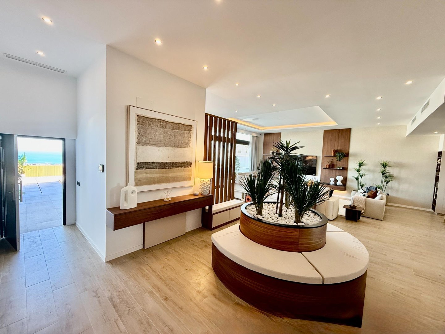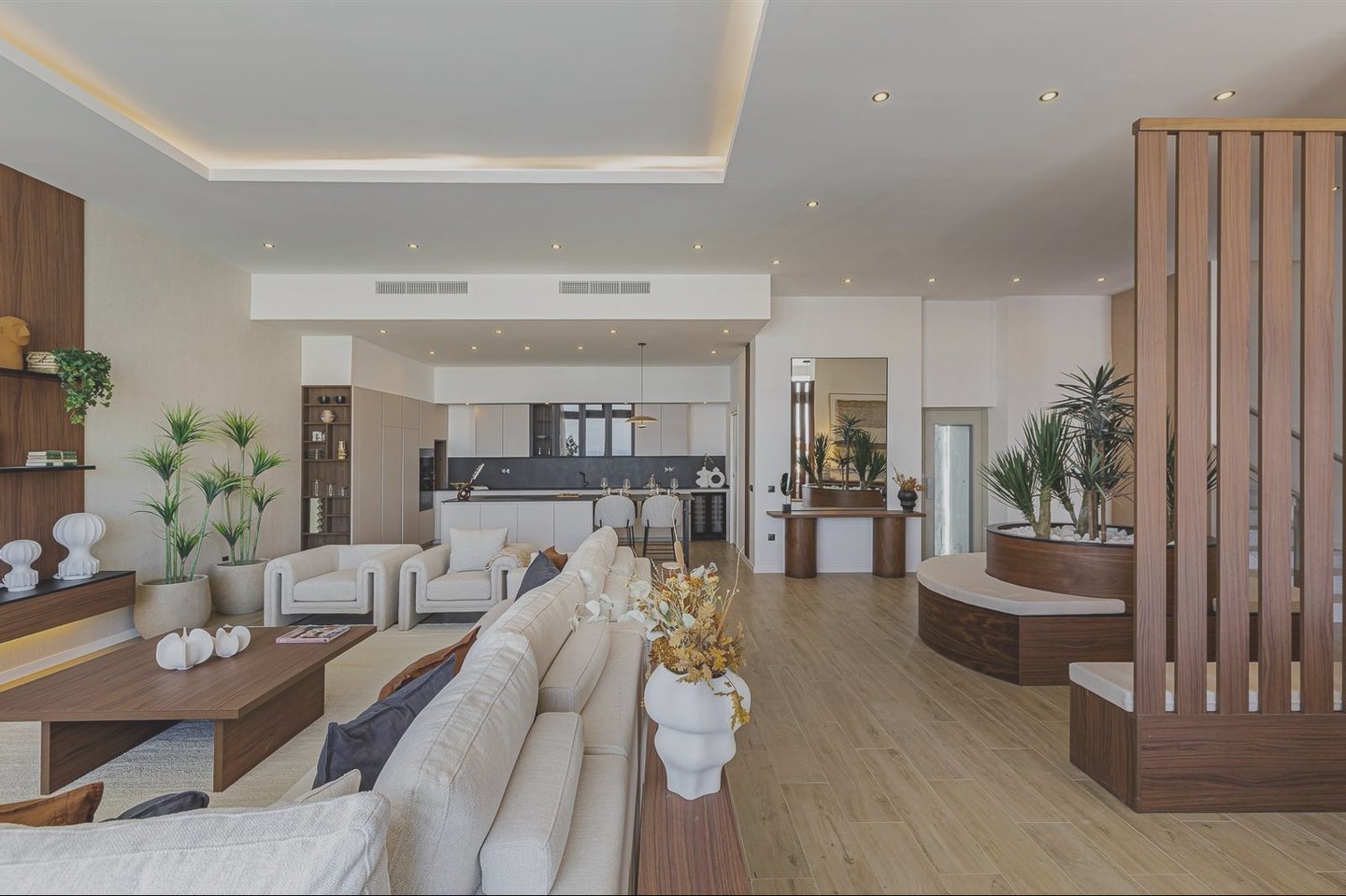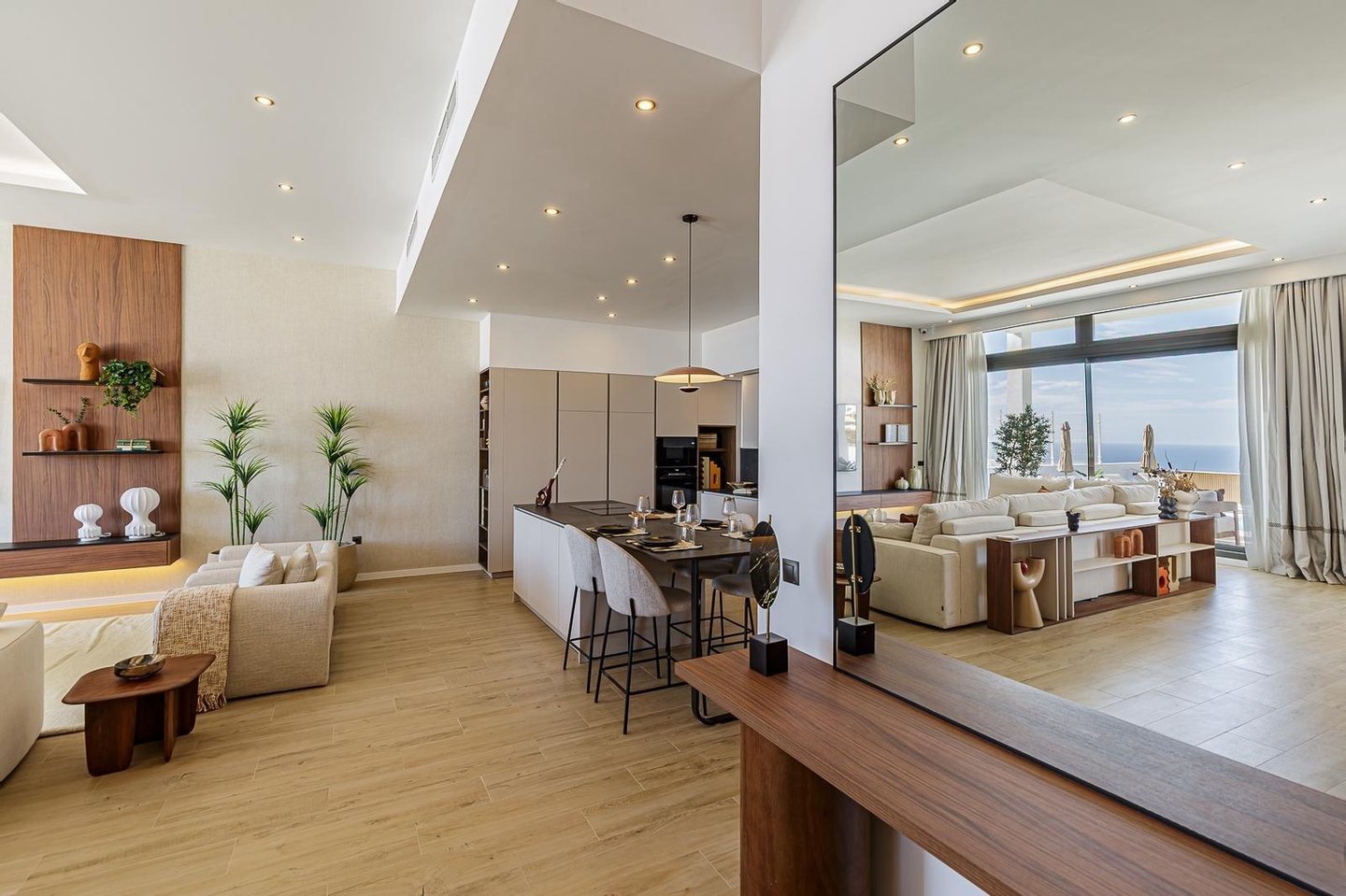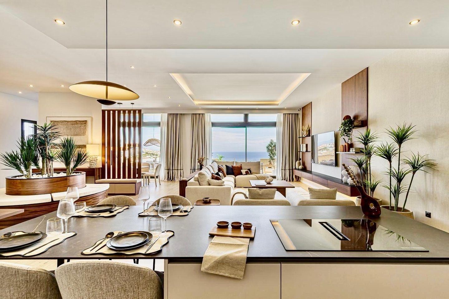 The open-plan kitchen connects seamlessly with the living area and terraces, creating a perfect indoor-outdoor lifestyle ideal for enjoying the Costa del Sol climate all year round.