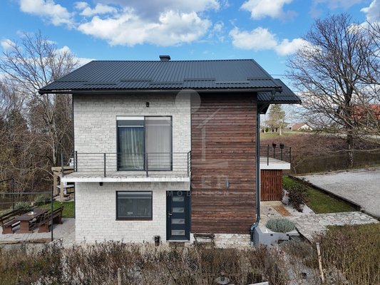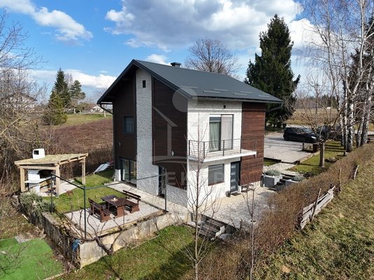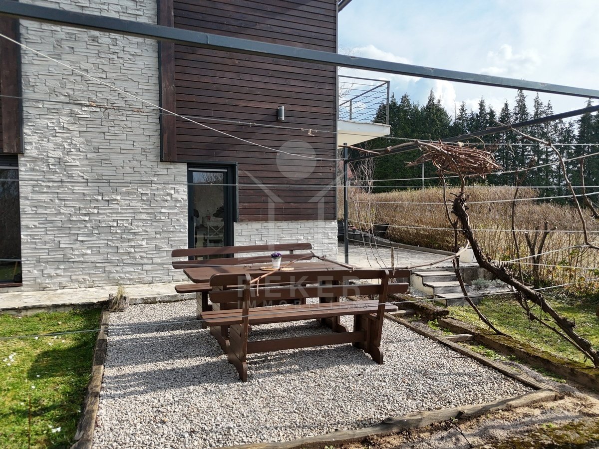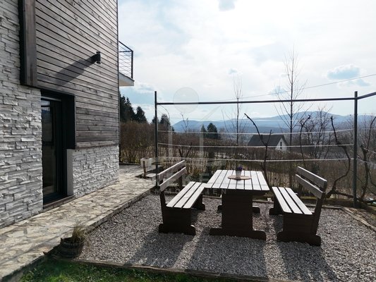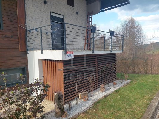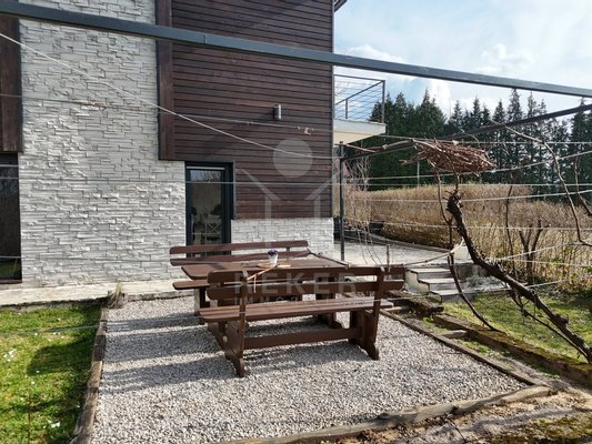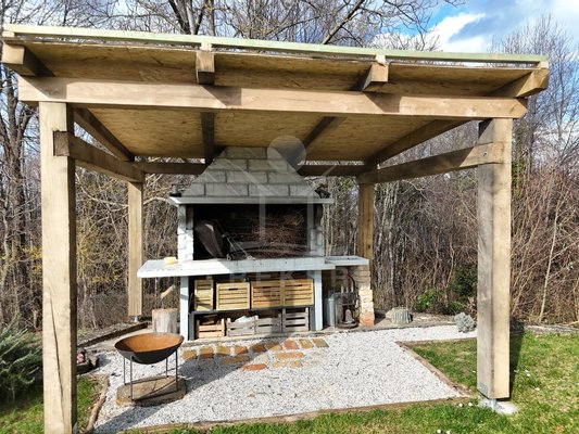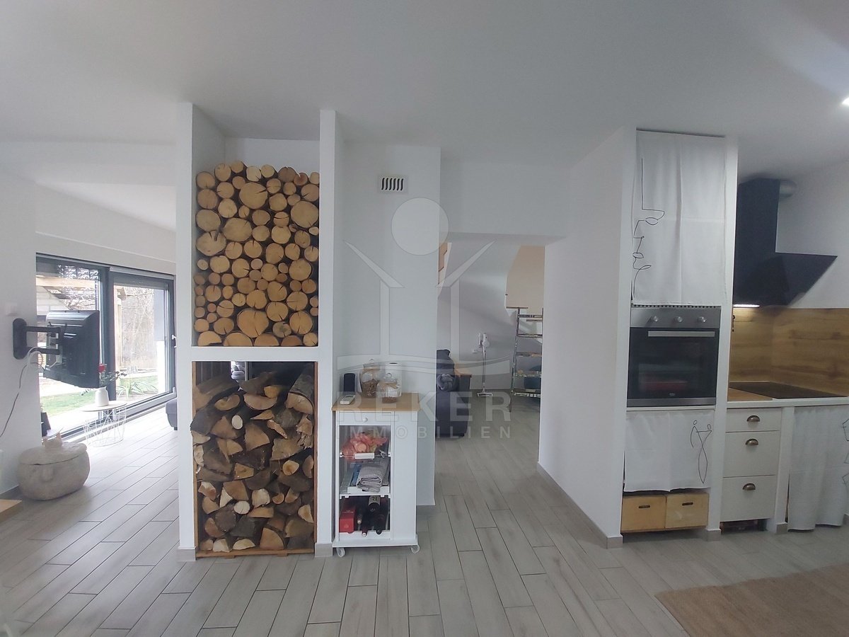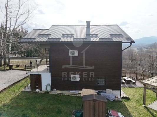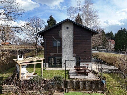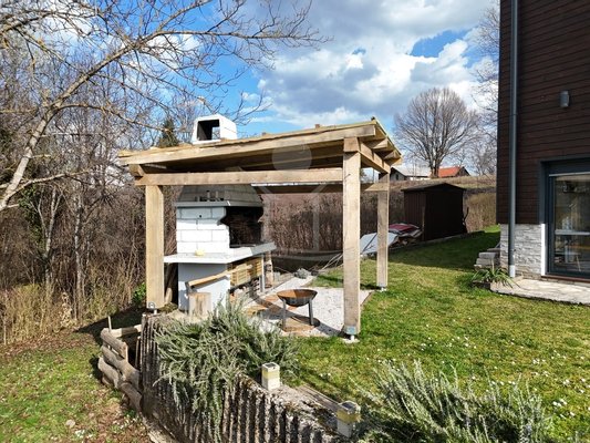 Das Grundstück umfasst 1.481 m² und vermittelt ein ländliches Ambiente. Zwei Terrassen bieten Platz zum Verweilen. Dazu kommen ein Grillplatz und ein Garten mit mehreren Obstbäumen. Die Fassade verbindet Holz mit dekorativen Steinelementen und passt sich der Umgebung am Waldrand stimmig an.