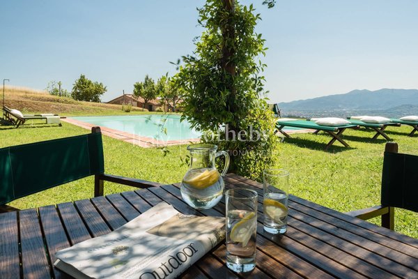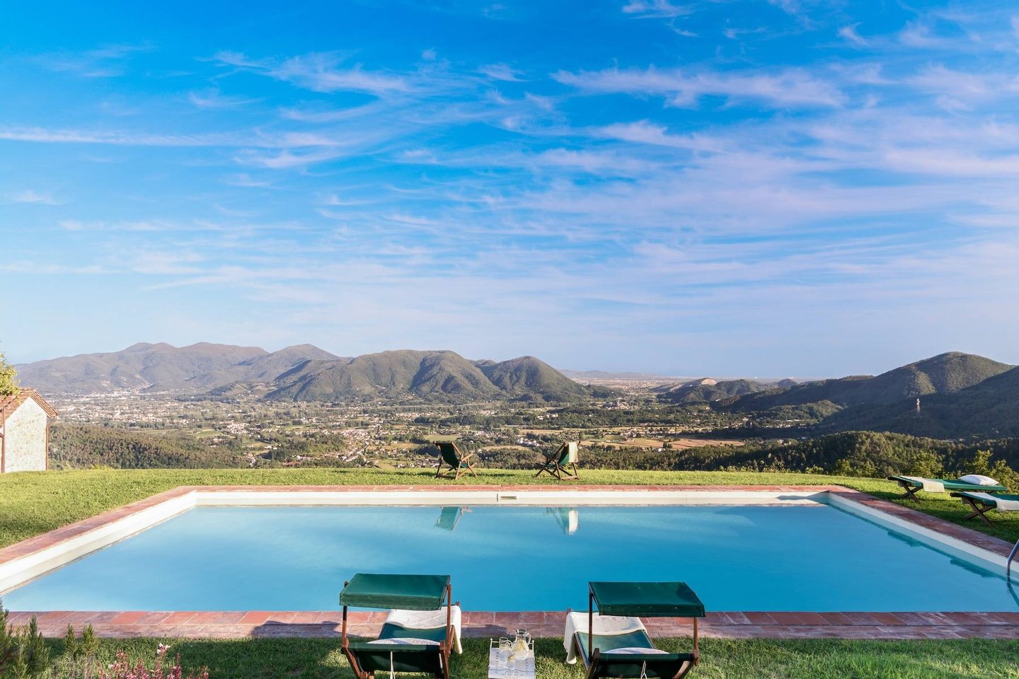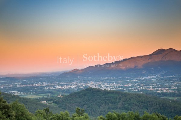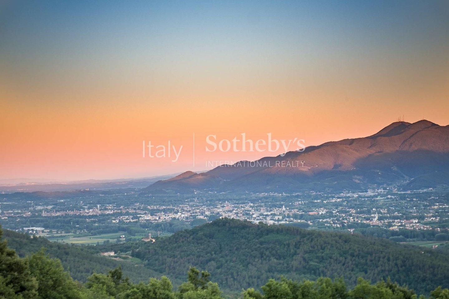Nestled among the gentle hills of Lucca, less than 10 km from the city, this extraordinary villa dating back to the 11th century is a rare gem of history and charm. Built entirely of exposed stone, the villa has been meticulously restored with original, hard-to-find ancient materials to preserve its authenticity and soul, while integrating it with modern comforts. The villa covers about 450 square meters, with two large verandas of 50 square meters each: one with a dining area and stone barbecue, the other perfect for relaxation. The interiors include six panoramic air-conditioned bedrooms, six bathrooms, a spacious kitchen, a dining room, an elegant living room, a TV area, and a long corridor leading to the rooms. Outside, the property features a 14x7 meter panoramic swimming pool, surrounded by approx. 34 hectares of land, three of which are devoted to historic vineyards and three to olive groves. The oil produced is of exceptional quality and the wine, with its renowned historical label, has received prestigious awards. The villa enjoys a breathtaking view that stretches over 40 km, from the city of Lucca to Pisa, reaching the sea of Livorno on clear days. The unusual breadth of the view makes this panorama one of the most extraordinary in the entire Lucca area, and certainly one of the most beautiful in all of Tuscany. The exceptional panorama combines with a rare mix of ample usable space and the enjoyment of absolute privacy, making the property perfect for the realization of any project, such as a tennis court or heliport. There is also the possibility to expand the interior area, subject to local regulations, and to raise an outbuilding of about 80 square meters, possibly with an underground cellar, subject to approval of the relevant authorities.The property's strength lies in possessing numerous exceptional qualities that are extremely hard to find, all at once, in one place.
