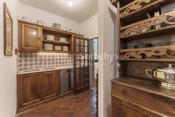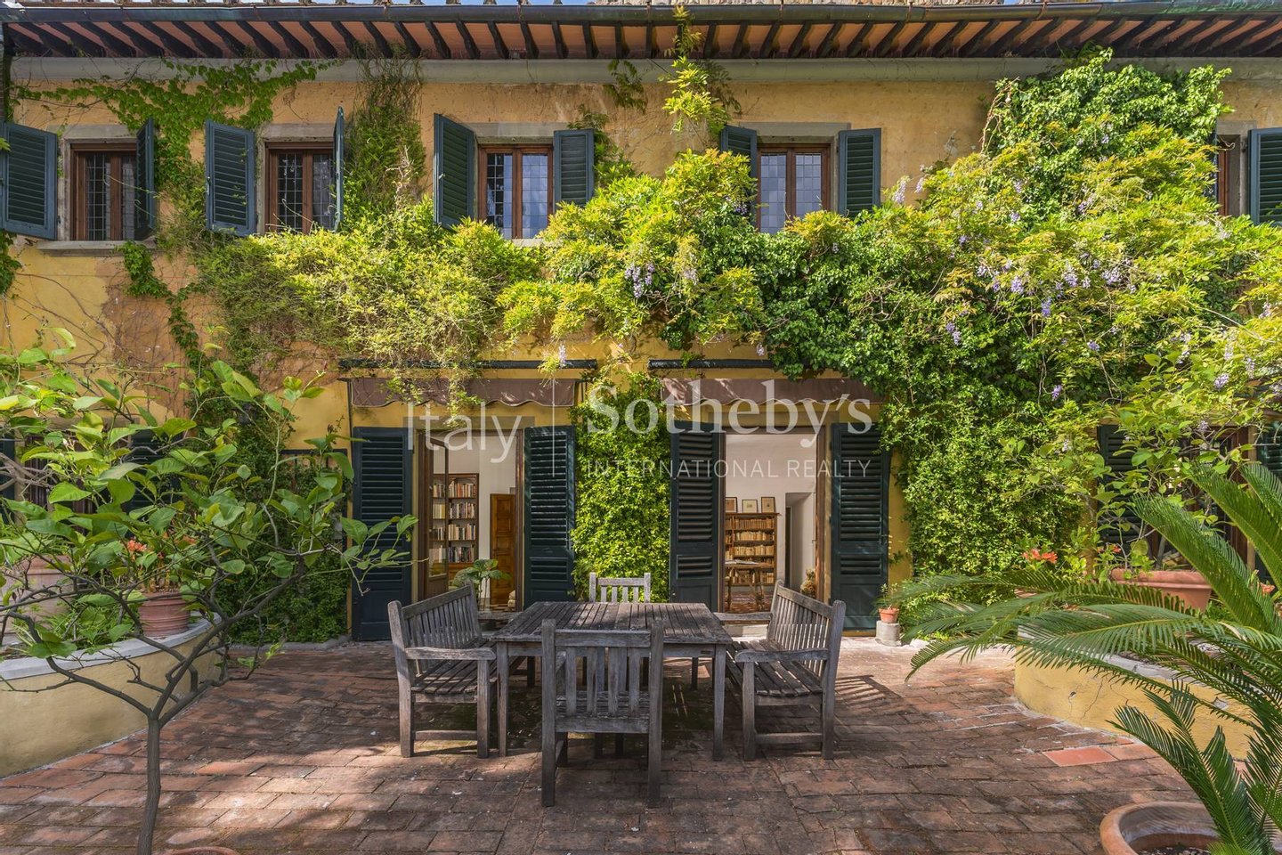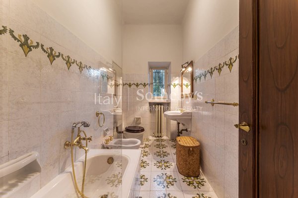 Nur zehn Minuten von der Piazza della Libertà entfernt erstreckt sich die Villa mit ca. 500 m² über zwei Ebenen plus Turm. Vom Eingang mit prachtvollen historischen Glasfenstern gelangt man in das Erdgeschoss mit drei Salons, davon zwei mit Kamin, sowie einem Arbeitszimmer, alle mit Zugang zum Garten, einer großen Küche, einem Esszimmer, einem Bad und einer Waschküche.