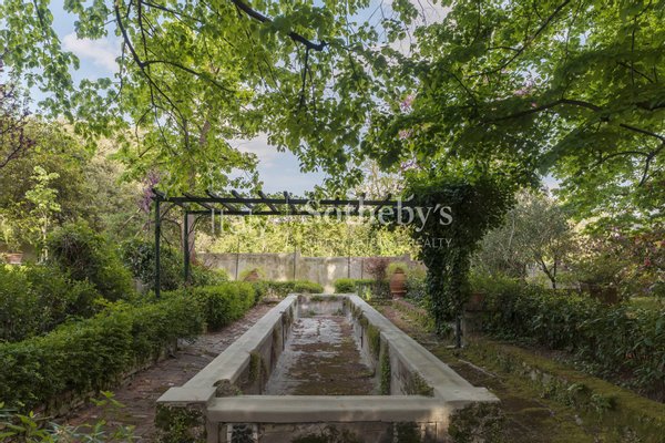 Im schönen Garten, teilweise terrassiert mit Essbereich, befinden sich eine romantische Loggia und ein Gewächshaus sowie ein stimmungsvolles rechteckiges Wasserbecken aus Stein. Zierpflanzen, Hecken und große Terrakottagefäße schaffen eine bezaubernde Atmosphäre, trotz der Nähe zur Innenstadt.